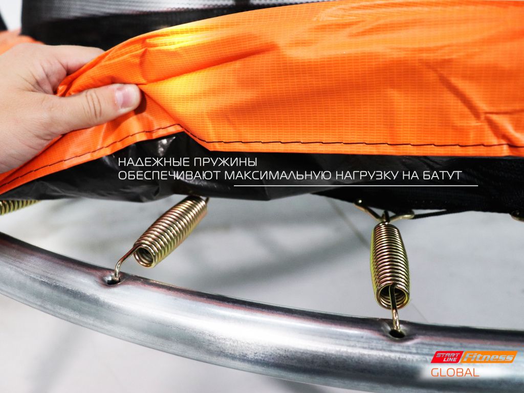 Батут GLOBAL SLF надежен, безопасен и долговечен. Прочная стальная рама с 3-мя опорами обеспечивает сбалансированный контакт с поверхностью. Батут максимально устойчив к переворачиванию. Рама и стойки оцинкованы снаружи и внутри в целях предотвращения коррозии. Материал прыжковой поверхности - плотная ткань ПВХ, устойчива к УФ излучению. Плотная сетка крепится к верхним стойкам. Стойки имеют мягкое покрытие из полиэтиленового пено-материала и защитные чехлы, что обеспечивает максимальную безопасность пользователю. В комплект входит удобная лестница с пластиковыми ступенями.