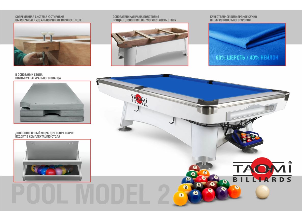 Бильярдные столы TAO-MI для игры в пул изготовлены в Китае под строгим производственным контролем Фабрики «Старт». Передовые модели с мощным каркасом и качественной юстировочной системой представляют собой современное решение для любителей американского пула.