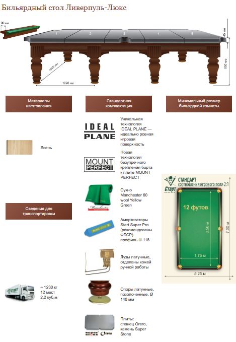 Бильярдный стол «Ливерпуль-Люкс» представляет собой воплощение лаконичности и профессионализма. Десятки клубов и сотни покупателей остановили свой выбор на этой демократичной модели. Стол декорирован патиной #40;эффект старины#41;, что придает натуральному дереву особую выразительность. «Ливерпуль-Люкс» может быть полностью изготовлен из массива ясеня либо выполнен в комбинированном варианте ясень/сосна. Шульцевское крепление ног обеспечивает столу высокую устойчивость. Система плавающих гаек в вертикальном креплении бортов позволяет идеальным образом крепить борт к плите. Благодаря этой уникальной технологии борт и плита становятся единым монолитом. Профессиональные амортизаторы бортов Start Super Pro на долгие годы гарантируют отличный отскок шара.