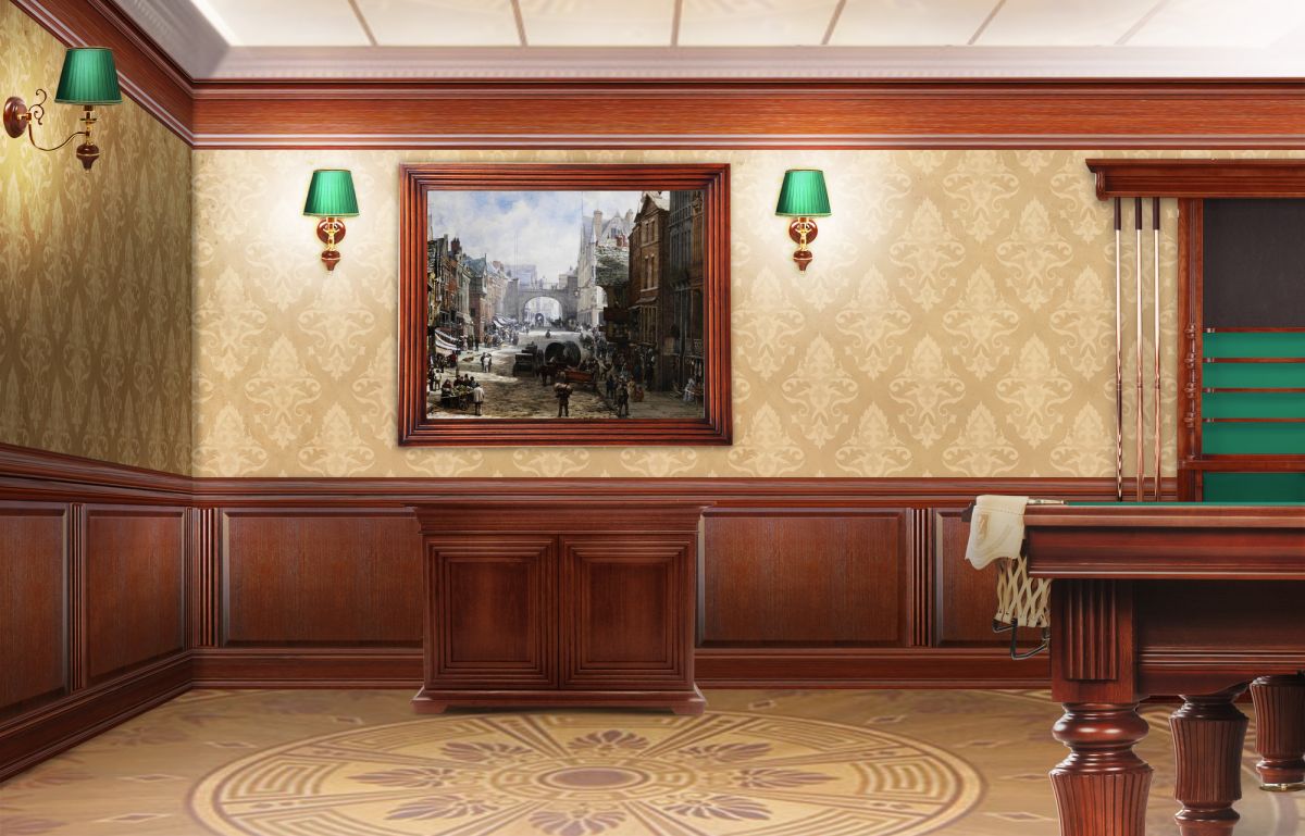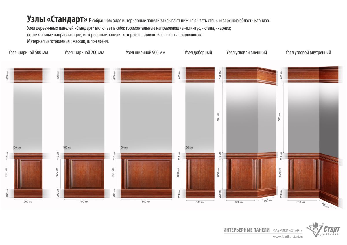 В собранном виде интерьерные панели закрывают нижнюю часть стены и верхнюю область карниза. Узел деревянных панелей «Стандарт» включает в себя: горизонтальные направляющие -плинтус, - стена, -карниз; вертикальные направляющие; интерьерные панели, которые вставляются в пазы направляющих.