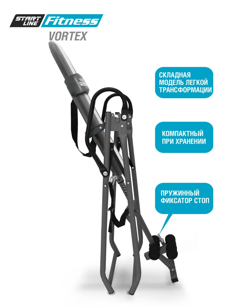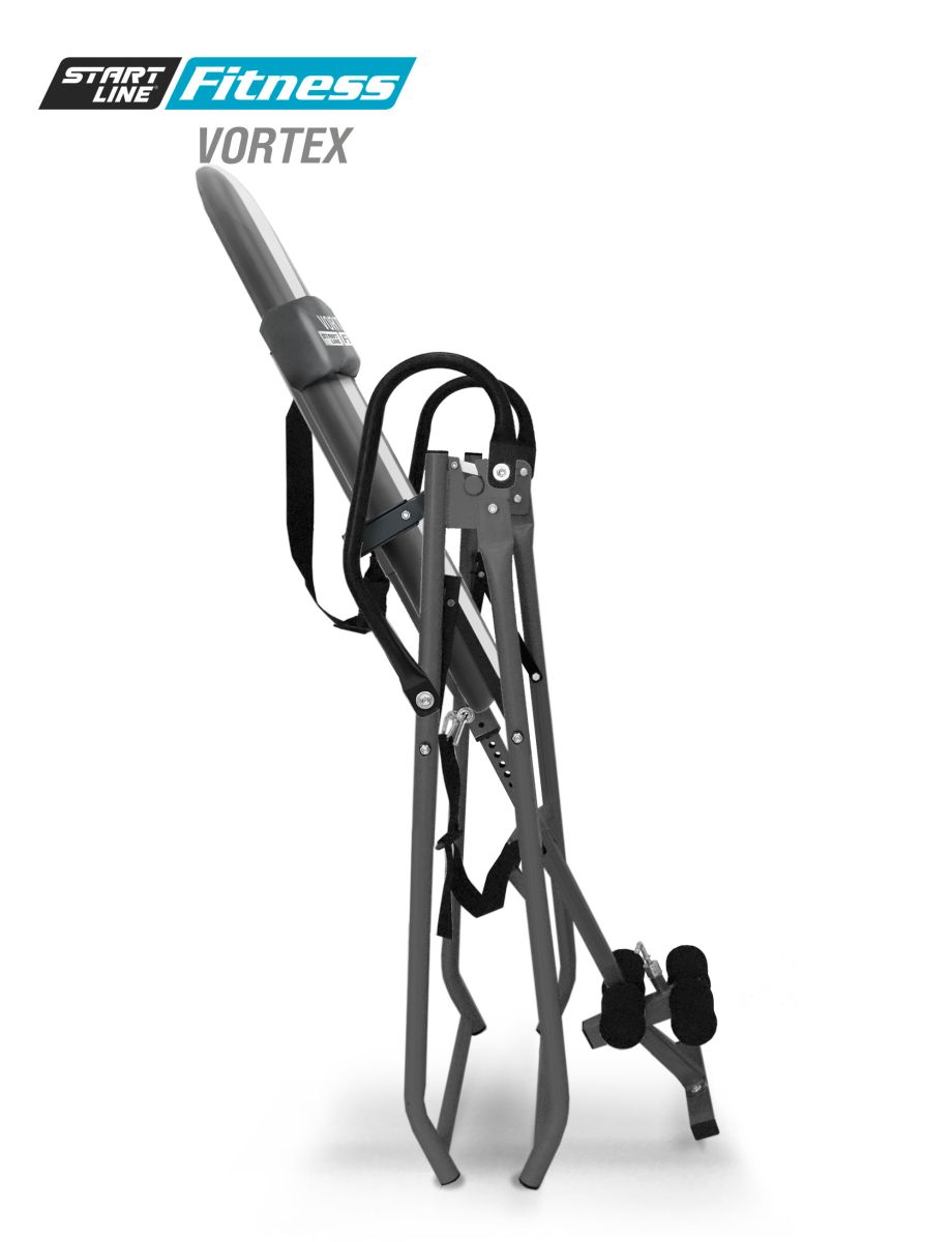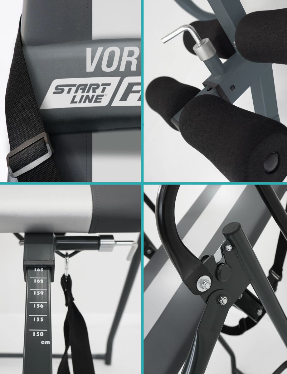 Инверсионный стол Vortex - новый ультрасовременный инверсионный тренажер от Start Line Fitness в стильном дизайне, который станет идеальным дополнением любого интерьера. Отличительной особенностью нового стола является наличие усиленной спинки, благодаря чему модель Vortex абсолютно безопасна в использовании. Стол с легкостью выдерживает нагрузку до 115 кг, при этом обладает небольшим весом. Инверсионный стол оснащен мягкой сверхпрочной спинкой для комфортной тренировки. Обивка спинки изготовлена из износостойкой и долговечной экокожи. Важным дополнением модели Vortex является удобная съемная подушка, которая позволяет правильно распределить и уменьшить нагрузку на мышцы спины. Инверсионный стол имеет складную конструкцию, которая позволяет убрать стол на хранение в одно движение, не занимая много места. Текстильная застежка фиксирует регулятор роста, что делает хранение еще более удобным и безопасным. Заниматься инверсионной терапией на столе Vortex могут как подростки, так и взрослые люди, ведь уровень роста новой модели изменяется от 150 до 197 см. Ограничение угла наклона осуществляется с помощью двух ремней, позволяющих выставить оптимальный угол для тренировки. При возврате в исходное положение энергоемкий амортизатор поглощает удар об опорную часть. Инверсионный стол Vortex оснащен надежной системой крепления ног. Механизм фиксируется одним движением, а мягкие валики исключают любые дискомфортные ощущения во время тренировки, надежно закрепляя голени в любом положении. Модель оборудована ремнем, позволяющим надежно зафиксировать положение тела, а также боковыми эргономичными ручками, которые обеспечивают безопасность и комфорт во время эксплуатации. Инверсионный стол Vortex - идеальное сочетание исключительной надежности конструкции, пользы от занятий, компактности и ультрасовременного дизайна.
