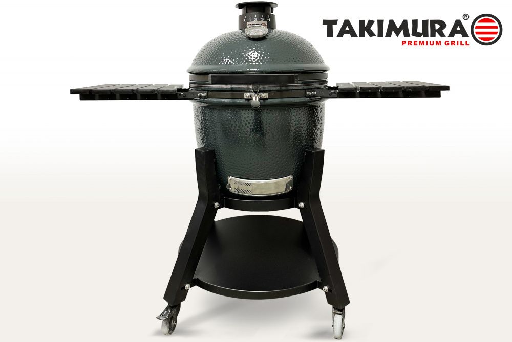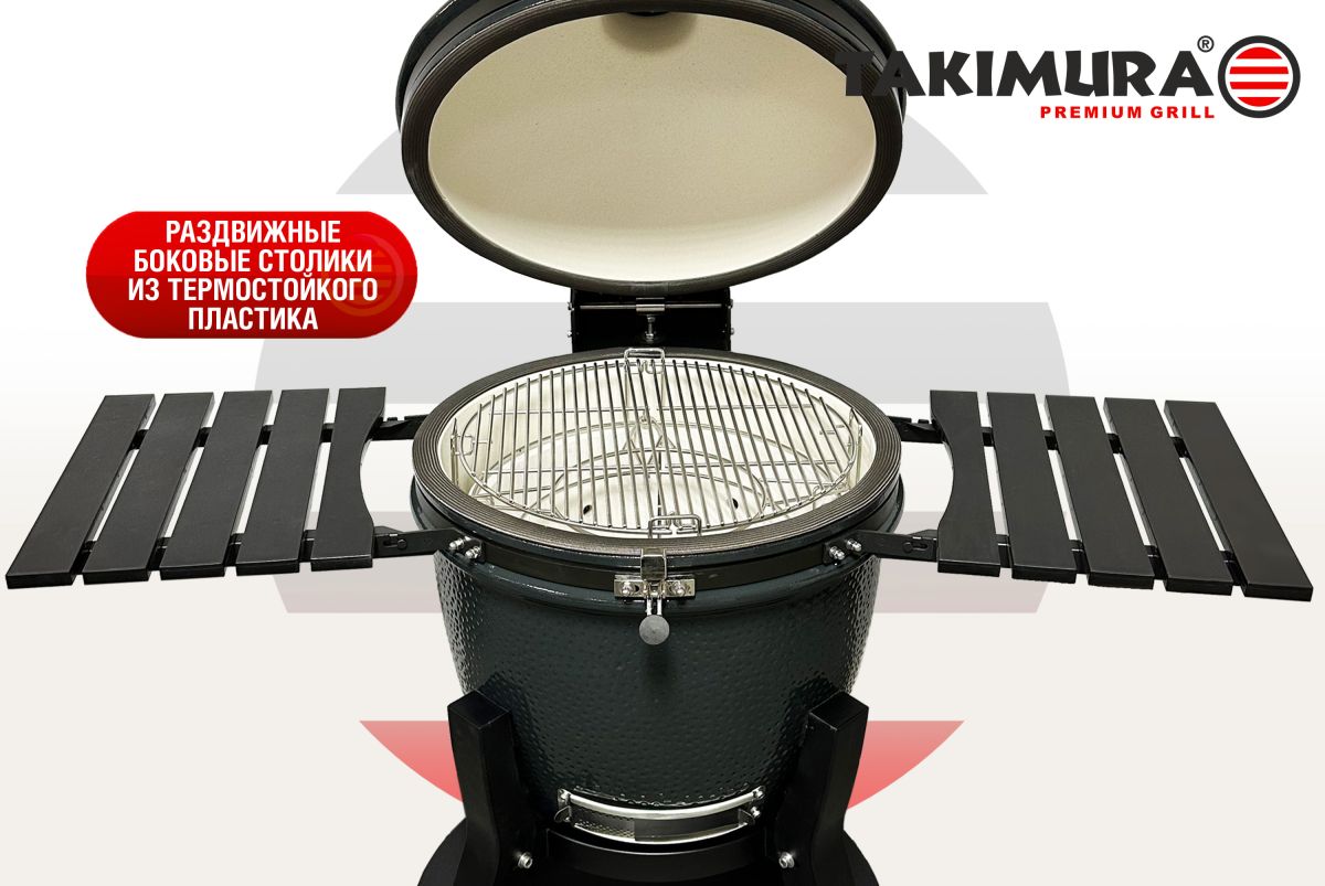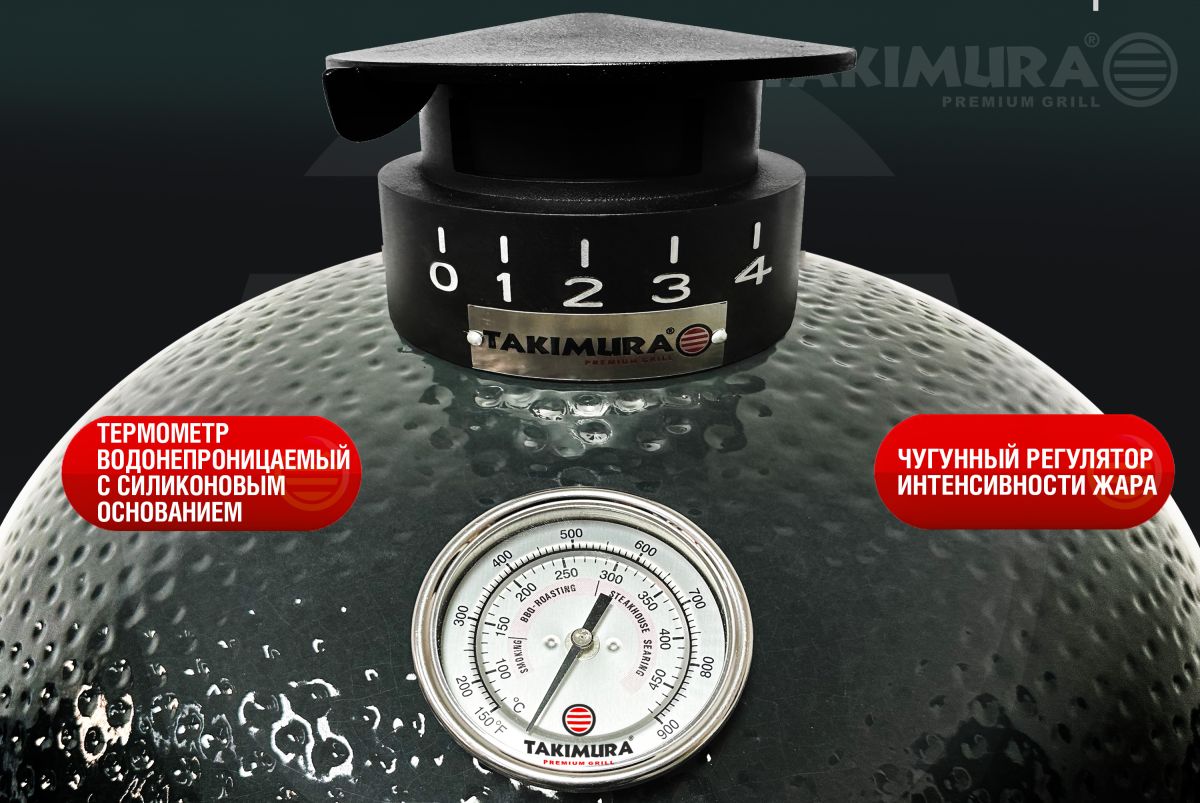 Керамический гриль Takimura — совершенство вкуса и технологий Погрузитесь в мир изысканного кулинарного искусства с керамическими грилями премиальной серии Takimura — воплощением элегантности и передовых технологий, созданных для тех, кто ценит аутентичный вкус блюд, приготовленных на углях. Каждый гриль серии Takimura — это не просто устройство, а настоящий шедевр, сочетающий в себе японские традиции и инновации, который открывает новые горизонты для кулинарных экспериментов. Керамический гриль Takimura — это высокотехнологичное устройство, обеспечивающее бескомпромиссное качество приготовления блюд и универсальность использования. Каждый гриль Takimura проходит индивидуальный контроль качества. Приобретая гриль Takimura, вы можете быть уверены в том, что получаете не только стильный, но и надежный инструмент для приготовления изысканных блюд. Каждый гриль имеет серийный номер, что подтверждает эксклюзивность и высокие стандарты производства. Takimura в графитовом цвете представляет собой истинное произведение искусства, гармонично соединяющее в себе функциональность и эстетическую привлекательность.nbsp;nbsp;Элегантные линии корпуса, обрамленные легким блеском керамики и графитовый цвет придает устройству глубину и характер, позволяя ему органично вписываться в любой интерьер — от уютного загородного домика до профессиональной кухни. Корпус гриля из сверхпрочной керамики нового поколения гарантирует долговечность и отличные теплоизоляционные свойства. Высококачественные материалы и передовые технологии открывают безграничные возможности для приготовления разнообразных блюд, превращая ужин в гастрономическое событие. Система подъема крышки с автоматической фиксацией купола в любом из доступных положений обеспечивает удобство и безопасность использования гриля. Армированный термостойкий уплотнитель обладает высокой огнеупорностью и термической стойкостью, что повышает теплоизоляцию и устойчивость к износу. Гриль оснащен трехуровневой системой решеток. Верхняя решетка выполняет функцию гриля, средняя служит подставкой для вока #40;не входит в комплект#41;, казана #40;не входит в комплект#41; или камня для пиццы #40;не входит в комплект#41;, нижняя - для керамического жароотсекателя #40;не входит в комплект#41;, который обеспечивает равномерное распределение тепла. Чугунный регулятор тяги позволяет точно настраивать интенсивность жара, а водонепроницаемый термометр профессионального уровня обеспечивает контроль температуры, что особенно важно для достижения идеального результата. Мобильная подставка с колесами, оснащенными фиксаторами, выполнена из стали, что гарантирует высокую надежность и легкость перемещения гриля. Подставка оснащена стальной полкой для удобного размещения аксессуаров и кухонной утвари. Складные боковые столики с основанием из стали и ручка крышки выполнены из пластика, устойчивого к УФ-и...