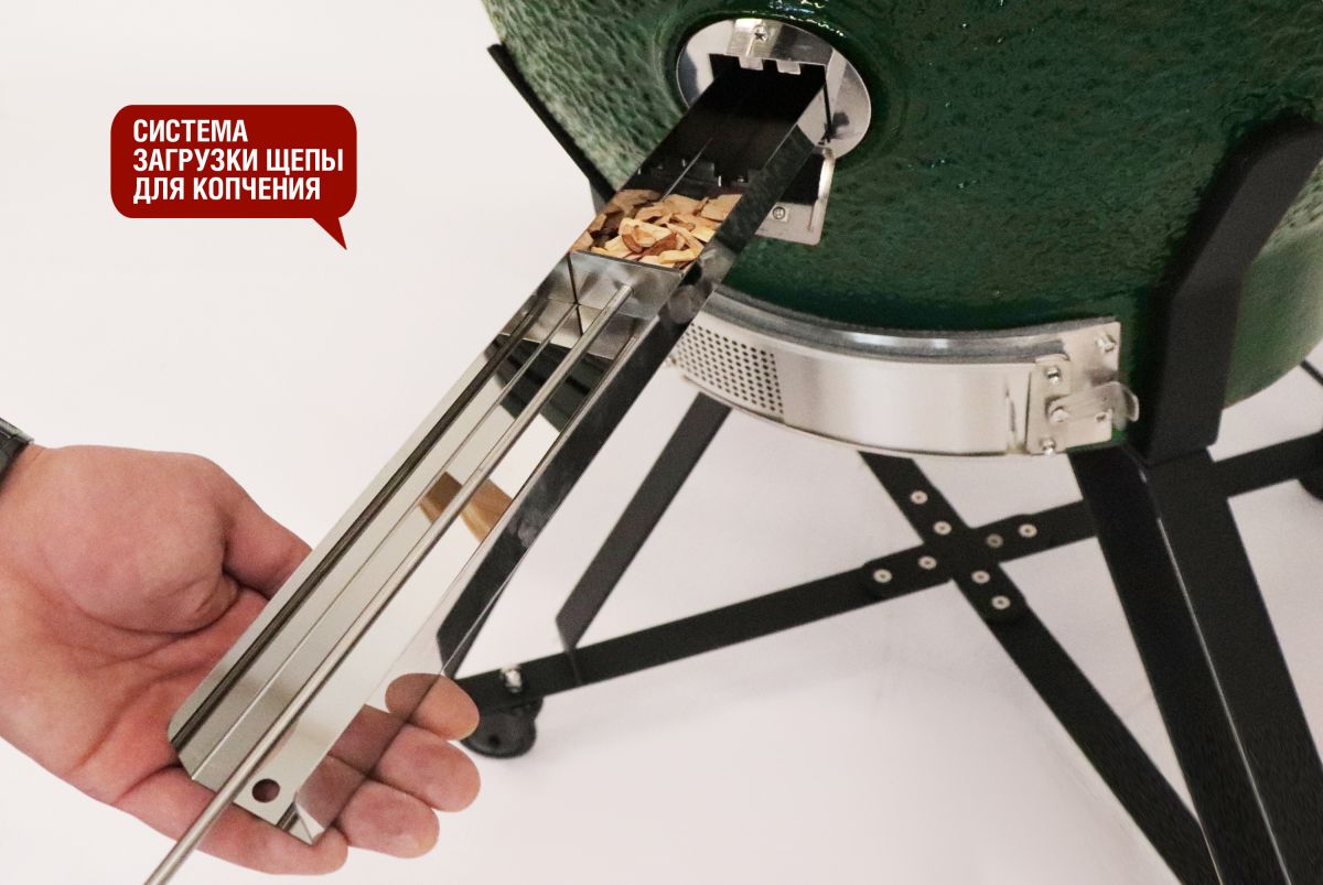 Start Grill SG24 PRO CFG имеет в своем арсенале удобную и эффективную систему подачи щепы CFG. Эта система представляет собой открывающийся отсек в корпусе гриля, направляющий лоток и толкатель. Теперь нет необходимости убирать продукты с решетки для приготовления, снимать саму решетку, чтобы загрузить дополнительную порцию щепы. Система CFG позволяет добавить щепу за считанные секунды, не открывая крышки гриля. Установленный на крышке гриля высокоточный термометр позволит вам контролировать температуру внутри гриля. Уже входящие в комплект камень для пиццы с держателем, решетка на второй уровень позволят разнообразить свои кулинарные шедевры, а фирменный чехол сохранит гриль в первозданном виде на долгие годы. Данная модель гриля подойдет многим, но акцент делается для профессионалов. Имея большой размер, устройство для подачи щепы, улучшенный состав керамики этот гриль станет незаменимым инструментом для кейтеринга, баров, ресторанов, BBQ зон.