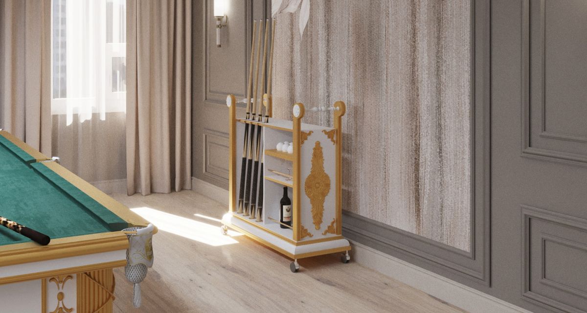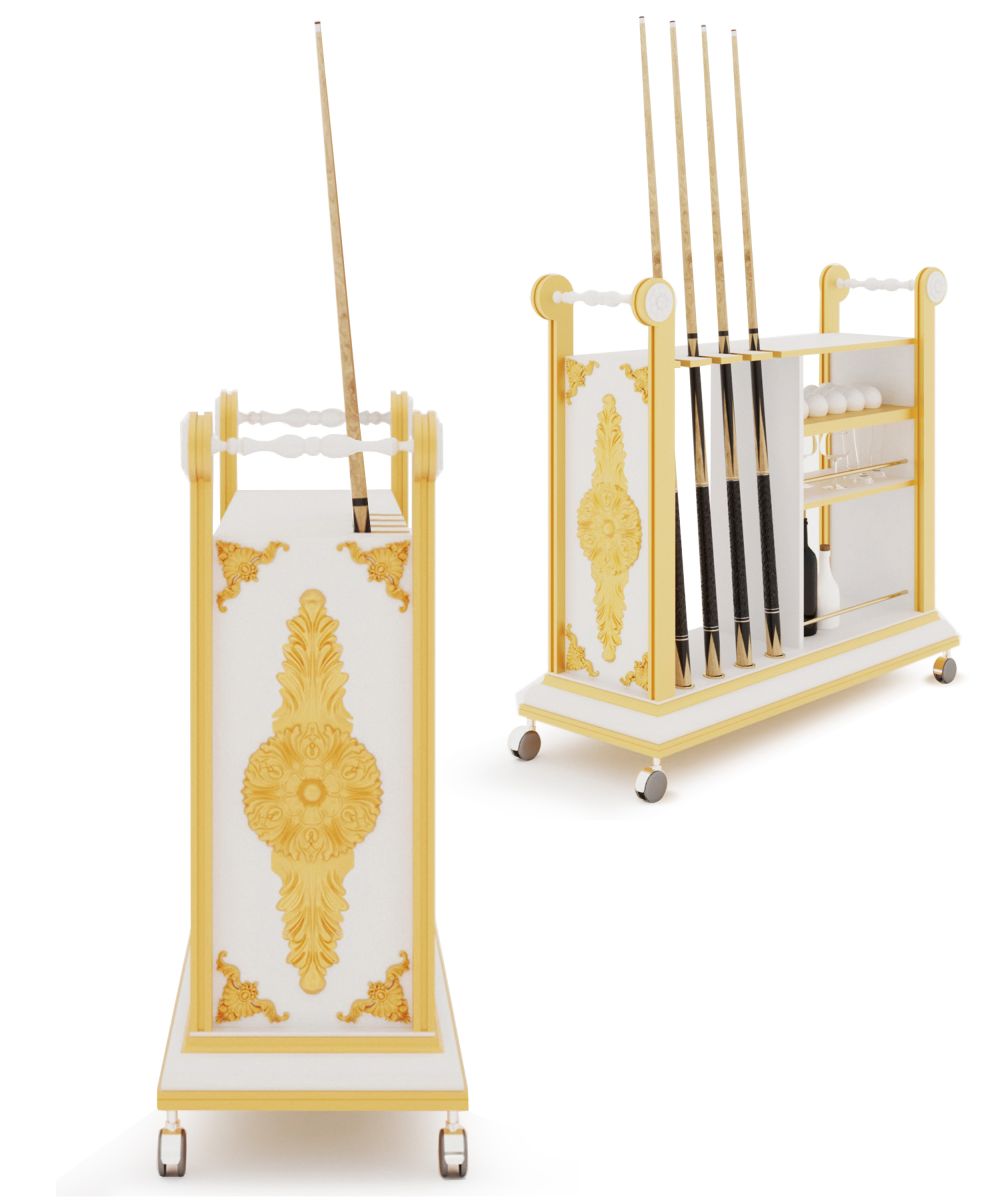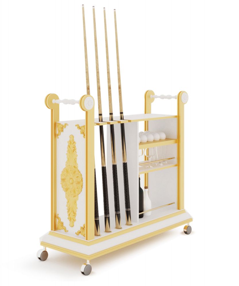 Напольная киевница «Антика» – эталон изысканной мебели для бильярдного оборудования, подходящий для роскошного интерьера. Киевница выполнена из граба. Авторская выкраска Blanco Plumon. Конструкция напольная с транспортировочными колесиками. Предназначена для 4 киев, позволяет разместить бильярдные шары и другие аксессуары для бильярда.
