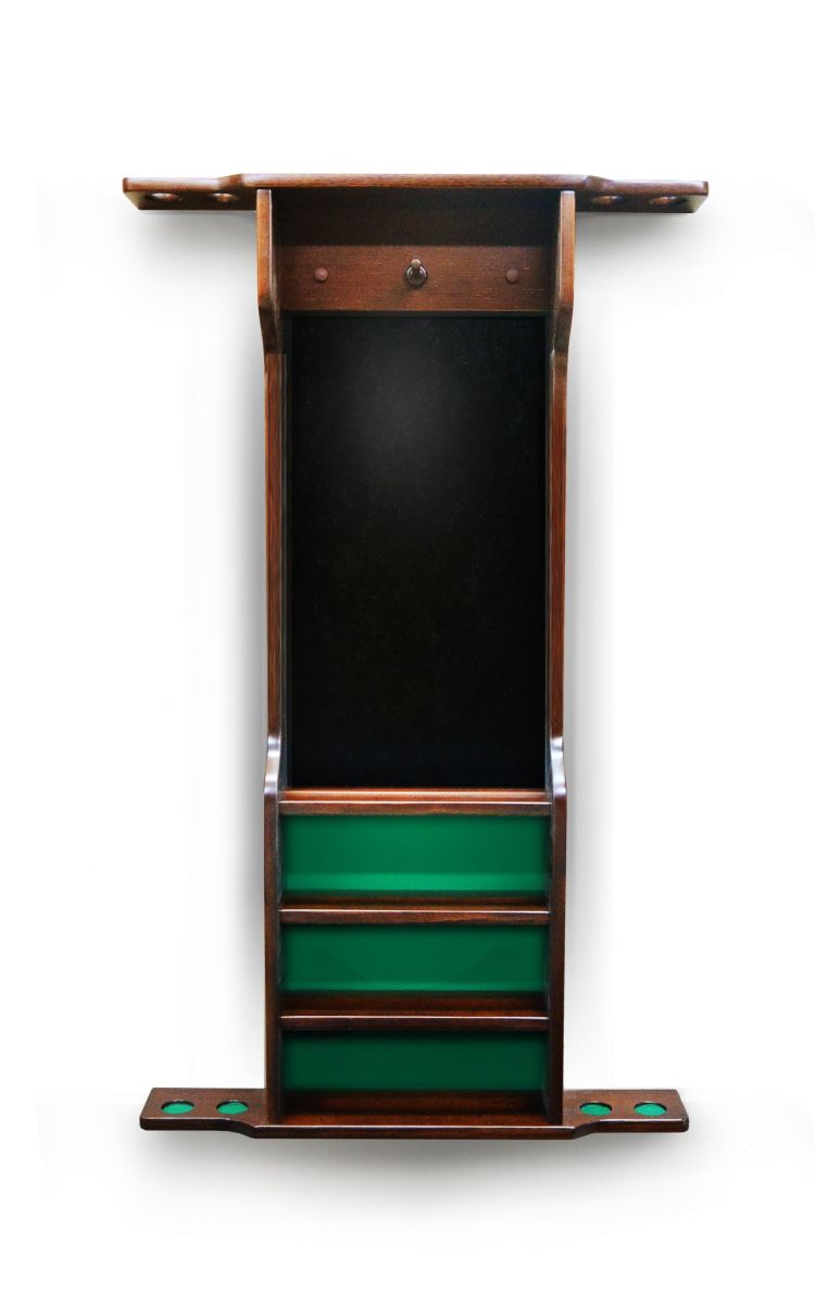 Модель настенная, предназначена для 4-х киев, позволяет разместить треугольник, мелки, а также бильярдные шары. Материал сосна или массив ясеня. Стандартная комплектация сукном цвета Yellow green. Есть возможность выбрать цвет из палитры Фабрики «Старт» Количество киев: 4 Высота : 1002 мм Ширина: 600 мм Глубина: 100 мм Материалы: сосна / ясень