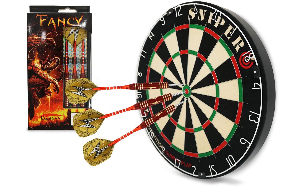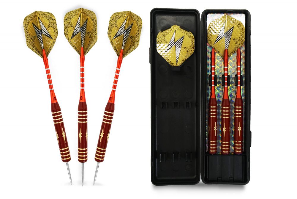 Дротики являются важнейшим элементом для игры в дартс, от их особенностей напрямую зависит уровень и качество игры. Комплект дротиков для игры в дартс среднего уровня из игровой серии FANCY. Комплект состоит из 3 дротиков весом 24 гр, баррель которых изготовлен из латуни. Латунные дротики являются общедоступным инструментом как для любителей, так и для профессионалов. Алюминиевые хвостовики в сочетании с оперением дают жесткую но при этом легкую конструкцию. Стальные иглы легко и устойчиво “входят” в мишень, что обеспечивает более точные и стабильные броски, исключая вероятность отскока. Комплект состоит из 3 баррелей, 3 хвостовиков, 3 оперений и кейса. Разборная конструкция дротиков позволяет заменить его хвостовик и оперение по мере изнашивания оборудования.