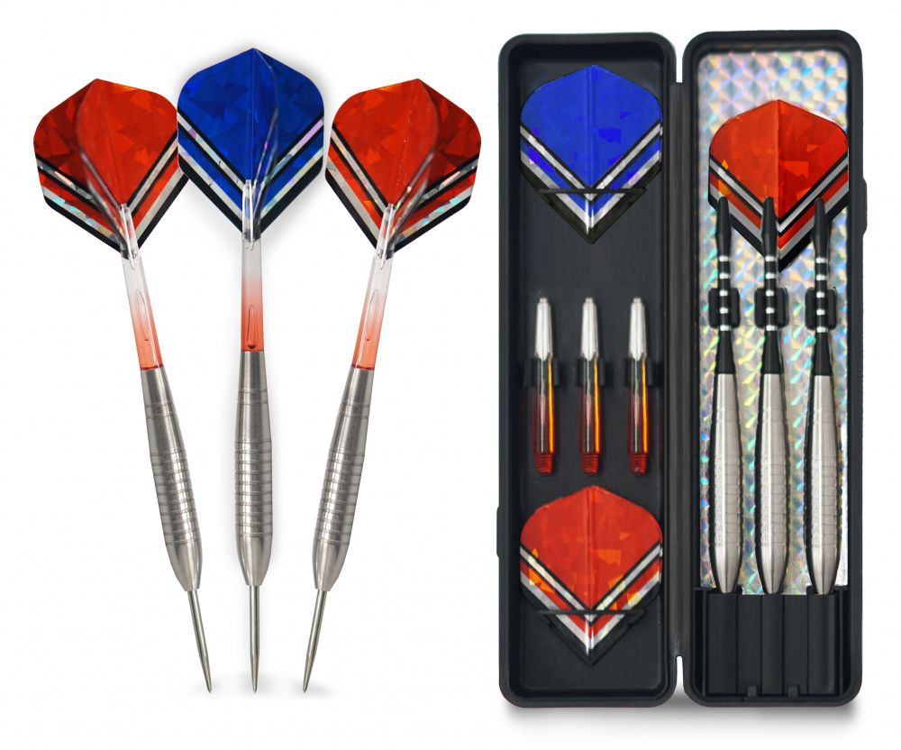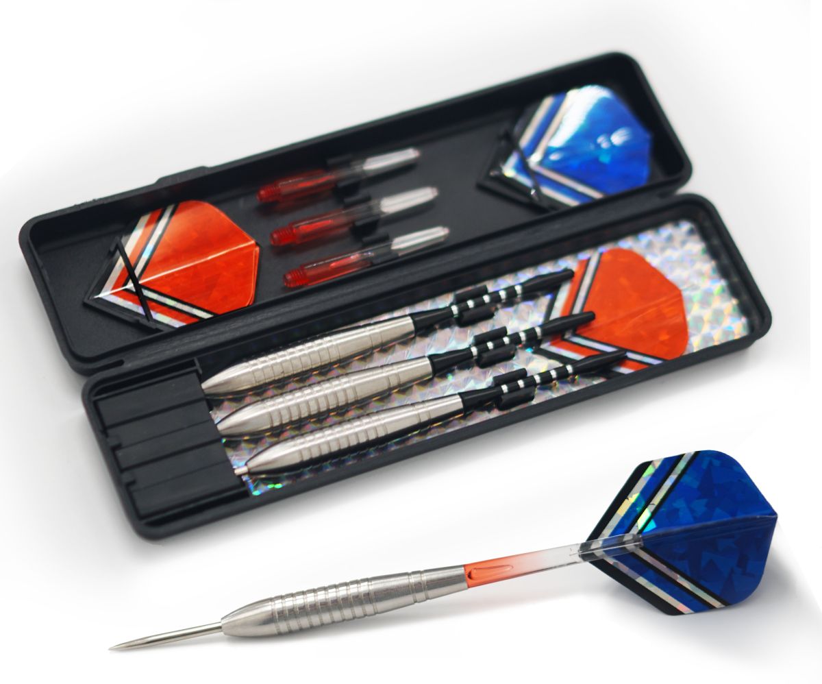 Комплект дротиков для игры в дартс среднего уровня, весом 23 гр. Дротики со стальными иглами для классических мишеней. В комплекте: футляр для хранения, 3 баррели, 3 алюминевых хвостовика, 3 пластиковых хвостовика, 6 оперений.