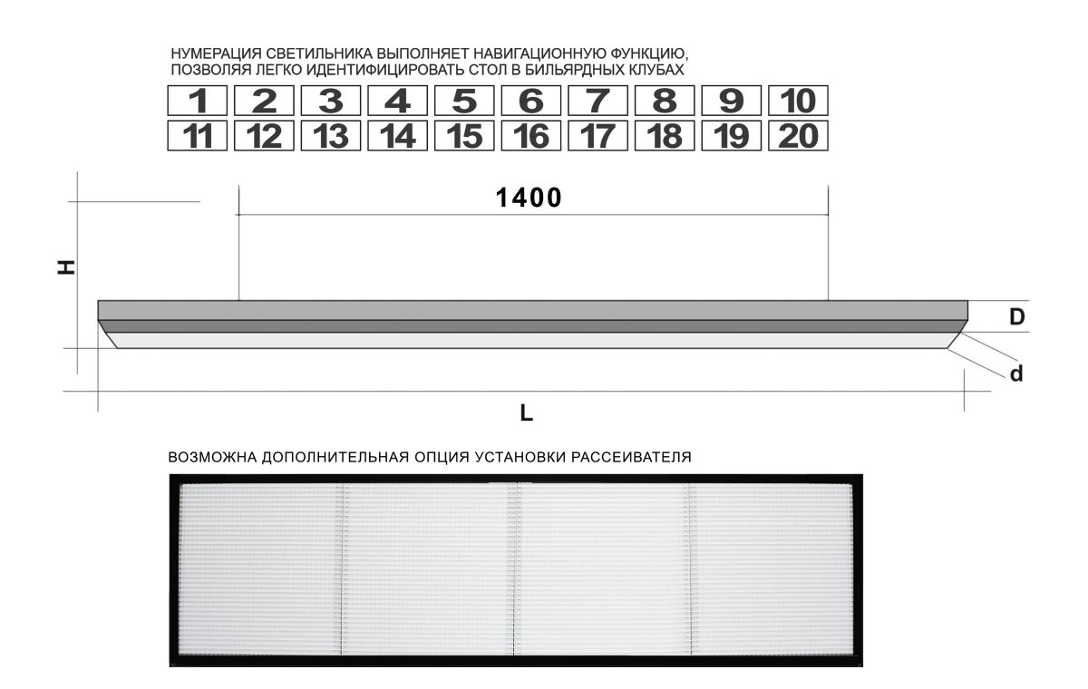 Современная светодиодная лампа «STARTBILLIARDS» Club Select 4 — это идеальное освещение для бильярда, где важна каждая деталь. Инженерная мысль, воплощенная в четырех монолитных секциях, создает сбалансированный световой поток, который равномерно покрывает всю поверхность стола размером 7-9 футов. Мощный светодиодный модуль лампы «STARTBILLIARDS» Club Select 4 дает яркий поток в 4500 люмен с холодным белым светом 4000K без теней и бликов, гарантируя максимальную концентрацию, точную цветопередачу сукна и шаров для исключительно прицельных ударов. Светодиодные панели общей мощностью 200Вт обеспечивают максимальную энергоэффективность и долгий срок службы. Лаконичный дизайн лампы «STARTBILLIARDS» Club Select 4 с безупречными пропорциями и матовыми поверхностями органично впишется в любой интерьер — от строгого клуба до современного лофта. В комплекте идет ярко подсвеченная номерная табличка, интегрированная в узкий торец лампы - важный функциональный элемент «STARTBILLIARDS» Club Select 4. Это решение является не только эстетически привлекательным дополнением, но и выполняет навигационную функцию, позволяя легко идентифицировать стол издалека, что особенно удобно для бильярдных клубов. Условные схематические обозначения: L - Длина светильника: 2430 мм d - Ширина светильника: 640 мм D - Высота светильника: 70 мм H - Длина троса #40;крепление#41;: 2000 мм