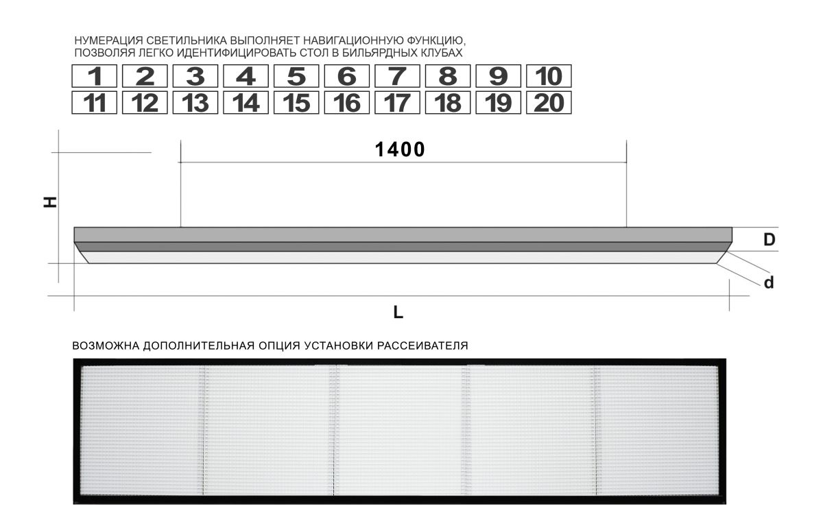 Световой поток модели соответствует и превышает требования МКП к осветительным приборам для проведения чемпионатов и турниров по бильярдному спорту - 1800 Lux в центре игрового поля при расстоянии 1300 мм от лампы до стола. Современная светодиодная лампа «STARTBILLIARDS» Club Select 5 — это идеальное освещение для бильярда, где важна каждая деталь. Инженерная мысль, воплощенная в пяти монолитных секциях, создает сбалансированный световой поток, который равномерно покрывает всю поверхность стола размером 10-12 футов. Мощный светодиодный модуль лампы «STARTBILLIARDS» Club Select 5 дает яркий поток в 4500 люмен с холодным белым светом 4000K без теней и бликов, гарантируя максимальную концентрацию, точную цветопередачу сукна и шаров для исключительно прицельных ударов. Светодиодные панели общей мощностью 250Вт обеспечивают максимальную энергоэффективность и долгий срок службы. Лаконичный дизайн лампы «STARTBILLIARDS» Club Select 5 с безупречными пропорциями и матовыми поверхностями органично впишется в любой интерьер — от строгого клуба до современного лофта. В комплекте идет ярко подсвеченная номерная табличка, интегрированная в узкий торец лампы - важный функциональный элемент «STARTBILLIARDS» Club Select 5. Это решение является не только эстетически привлекательным дополнением, но и выполняет навигационную функцию, позволяя легко идентифицировать стол издалека, что особенно удобно для бильярдных клубов. Возможна дополнительная опция уставновки рассеивателя. Условные схематические обозначения: L - Длина светильника: 3020 мм d - Ширина светильника: 640 мм D - Высота светильника: 70 мм H - Длина троса #40;крепление#41;: 2000 мм