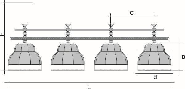 Эксклюзивный бильярдный светильник создан под бильярдный стол и бильярднуюnbsp;nbsp;коллекцию одноименной серии. Условные схематические обозначения: Н — общая высота светильника / 2065 мм L — общая длина светильника / 2420nbsp;nbsp;мм D — высота плафона / 395 мм d — диаметр плафона / 500 мм C — расстояние между осями / 640 мм
