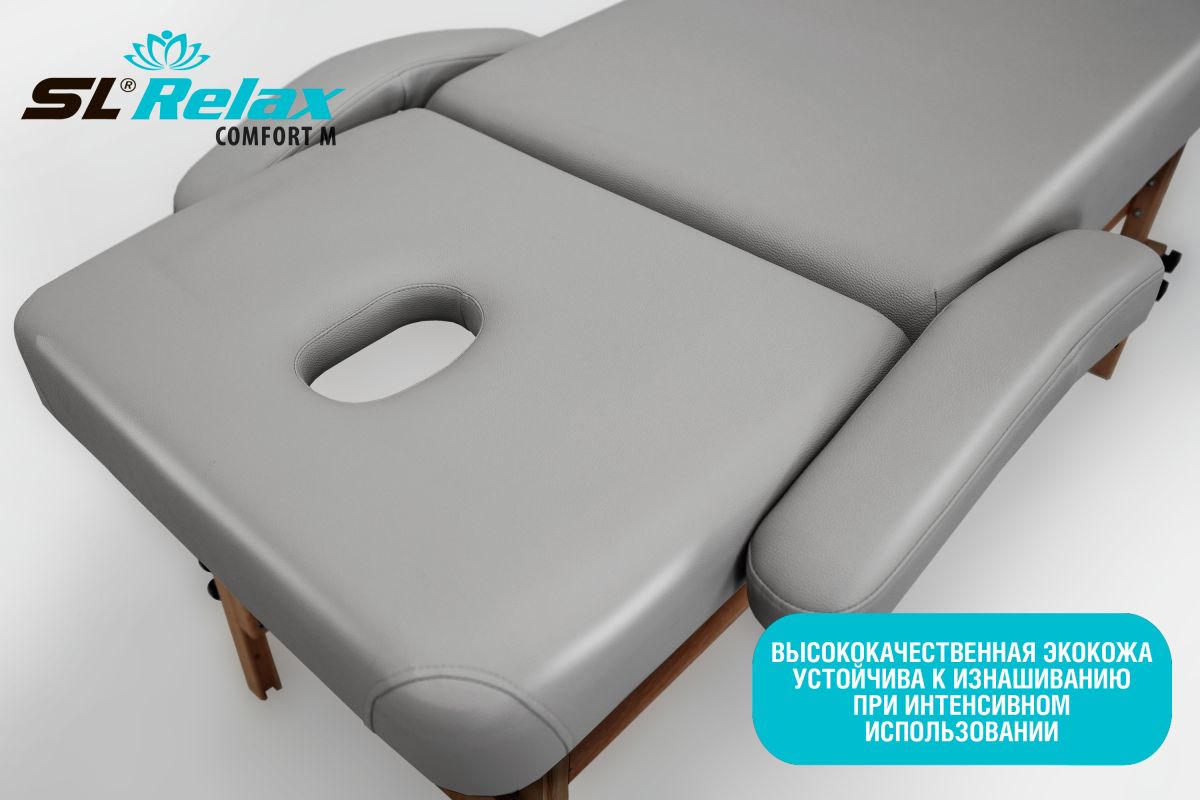Профессиональный массажный стол Relax Comfort M создан на базе успешной модели Relax Comfort с улучшенной конструкцией и дополнительными элементами комфорта в виде подлокотников и подушки. Эта модель идеально подходит для профессионального массажа, обеспечивая максимальное удобство как для клиента, так и для мастера.nbsp;nbsp; Улучшенная конструкция модели подарит максимальный комфорт во время массажа спины, шеи и ног. Стол оснащен мягкими подлокотниками и подушкой для дополнительного удобства клиента. Регулируемый подголовник с механическим фиксатором позволяет настроить оптимальный наклон, а отверстие для лица обеспечит удобное положение головы при массаже спины и шеи. Устойчивые ножки и усиленная конструкция с функциональной стеллажной полкой для хранения аксессуаров выполнены из дерева повышенной прочности. Удобная полка позволит мастеру расположить рабочие принадлежности, такие как валик для массажа, полотенца, масла и прочее. Прочный деревянный каркас гарантирует долговечность и устойчивость.nbsp;nbsp;Обивка выполнена из влагостойкой PU кожи, благодаря чему поверхность стола можно легко продезинфицировать или очистить в случае появления загрязнений, сохраняя безупречный вид даже при интенсивном использовании.nbsp;nbsp;Для удаления загрязнений достаточно протереть поверхность стола мягкой влажной тряпочкой из микрофибры. Relax Comfort M – это усовершенствованная версия проверенной модели, которая удовлетворит потребности даже самых взыскательных специалистов и их клиентов.nbsp;nbsp; *Обратите внимание: оттенок обивки на фото может незначительно отличаться от реального.*