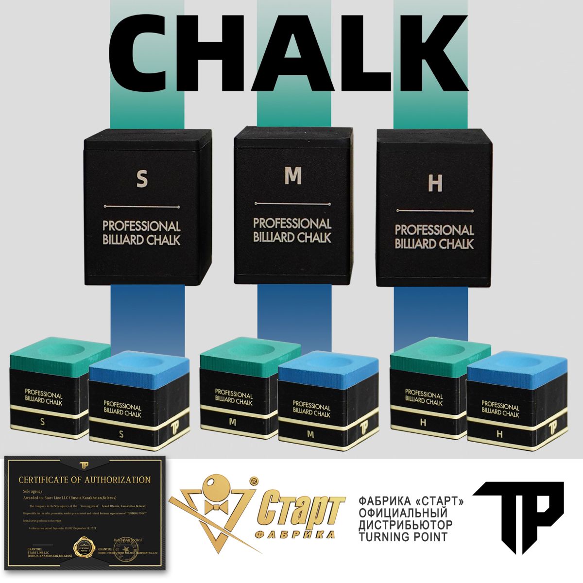 Мел Turning Point Pro M предназначен для наклеек средней жесткости, так как в структуру спрессованной смеси входит сбалансированный порошок. В отличии от S обладает добавочной твердостью строения, поэтому экономичней. Он равномерно ложиться на поверхность и способен долго держаться на наклейке. Мел отличают высокие абразивные свойства, он создает лучшее трение и уровень сцепления между наклейкой средней жесткости и шаром, минимизируя вероятность неудачного удара. В палитре два основных цвета: синий и зеленый, в соответствии с самыми популярными цветами сукна. Следы от мела минимально заметны на сукне. Для удобства использования на дно мела встроена специальная металлическая пластина, поэтому его легко и быстро можно закрепить на магнитном держателе. Упаковка мела имеет отрывной сегмент, что позволяет регулировать высоту этикетки по мере расходования мела.