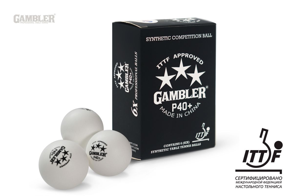 Gambler P40#43; - полностью синтетические мячи для соревнований, одобренные международной федерацией по настольному теннису #40;ITTF#41;. P40#43; разработан для большей продолжительности вращения и обладает превосходной прочностью по сравнению с обычными конструкциями из полиэстера или АБС. Gambler P40#43; были независимо разработаны и произведены компанией Gambler, что обеспечивает превосходное качество и игровые возможности. В мячах Gambler используется специальное соотношение смолы АБС, что делает их более твердыми и быстрыми, как популярные мячи из Японии. Мячи обладают быстрым вращением, высокой скоростью и полностью являются синтетическими #40;НЕ ЦЕЛЛУЛОИДНЫМИ#41;. Gambler внес изменения в собственный производственный процесс: конструкция состоит из 2 частей и эти мячи используются почти на каждом профессиональном соревновании по всему миру.