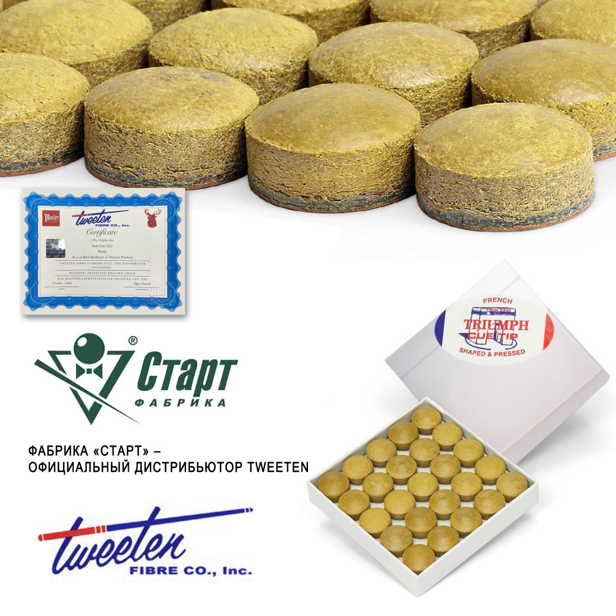 Наклейки Triumph были выпущены на американский рынок в 80-х годах XX века и с тех пор пользуются уважением и спросом у игроков и производителей киев Как и другие наклейки Tweeten Triumph изготавливаются из тончайшей импортной кожи, прошедшей процесс дубления c использованием натуральных танинов без применения вредных химикатов. Благодаря выбору наиболее твёрдых частей кожаных шкур и поддержанию однородности состава наклеек, Triumph долговечнее многих других конкурентов, лучше держат мел и меньше поддаются деформации. Соединительная прослойка между наклейкой и киём #40;фибра#41; способствует дополнительной защите наконечника от раскалывания при сильных ударах. Тесты на сжатие с помощью дюрометра показывали, что эти наклейки с показателем более 70 по шкале А Шора близки по прочности к автомобильным протекторам и изделиям из прочной резины. Это весомый аргумент для игроков, предпочитающих сильные удары. Наклейки Triumph обладают стабильными игровыми характеристиками, поэтому их устанавливают на свои кии как опытные