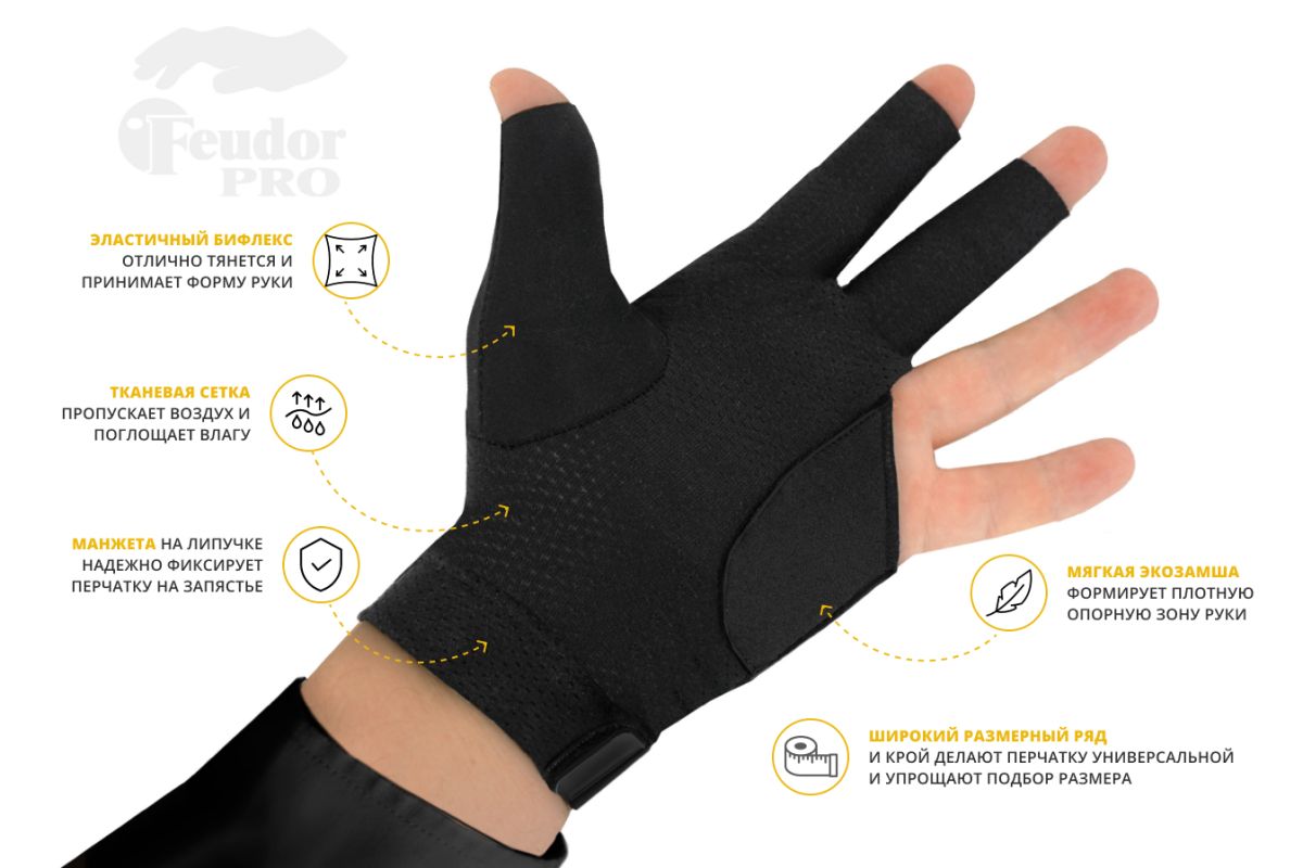 Высококачественные материалы делают перчатку Feudor Pro black максимально комфортной. Ее использование позволяет обойтись без талька для рук, обеспечивает плавное скольжение кия и повышает точность удара даже в самые напряженные моменты игры. Перчатка плотно прилегает к коже и отлично сидит на руке, что позволяет игроку максимально чувствовать кий и дарит самые яркие эмоции от игры. Благодаря манжете перчатка Feudor Pro black надежно фиксируется на запястье, обеспечивая стабильность и уверенность при каждом ударе.