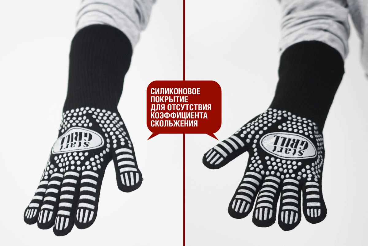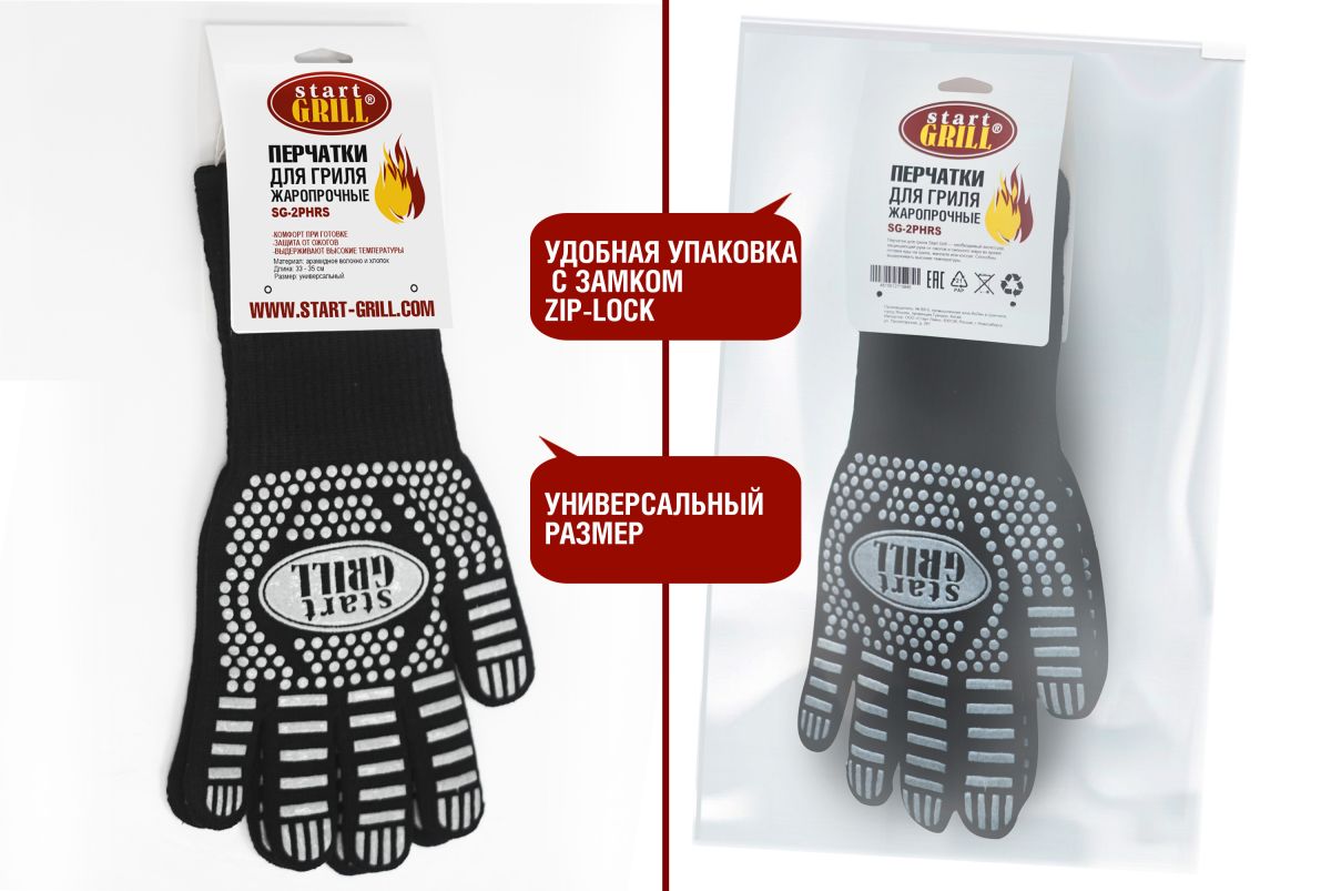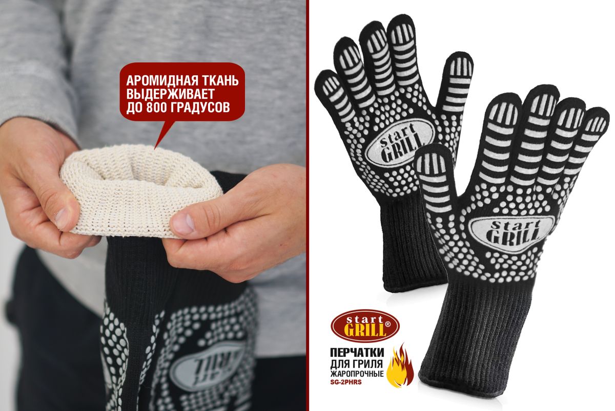 Жаростойкие перчатки Start Grill — это незаменимый аксессуар для защиты рук от высоких температур и ожогов во время готовки еды на гриле, мангале или костре. Кроме того, обладая огнеупорным свойством, их можно использовать и в других целях, например подкинуть или переложить дрова в печи. Удлиненная манжета обеспечит максимальную защиту запястий. Прочная и огнеупорная арамидная ткань снаружи в сочетании с хлопковой тканью внутри позволит без опасений безопасно прикасаться к разогретым частям гриля и решеткам в время готовки. Перчатки длиной в 35 см и шириной в 17 см обеспечат максимальный комфорт и безопасность при воздействии высоких температур, а именно: до 10 секунд при температуреnbsp;nbsp;800 С° и до 60 секунд при температуре 100 С°. Специальное не скользящее покрытие перчаток не портится и не деформируется при контакте с горячими предметами. В комплекте 2 перчатки.