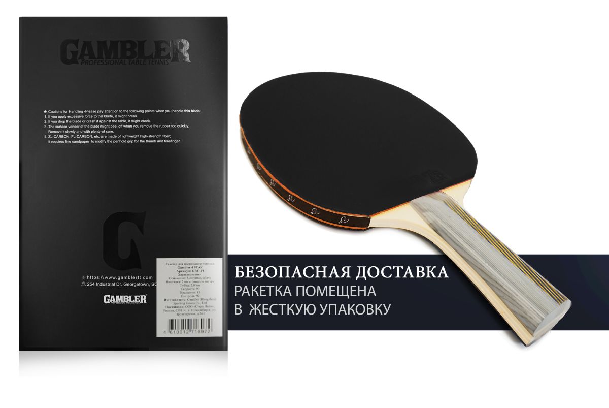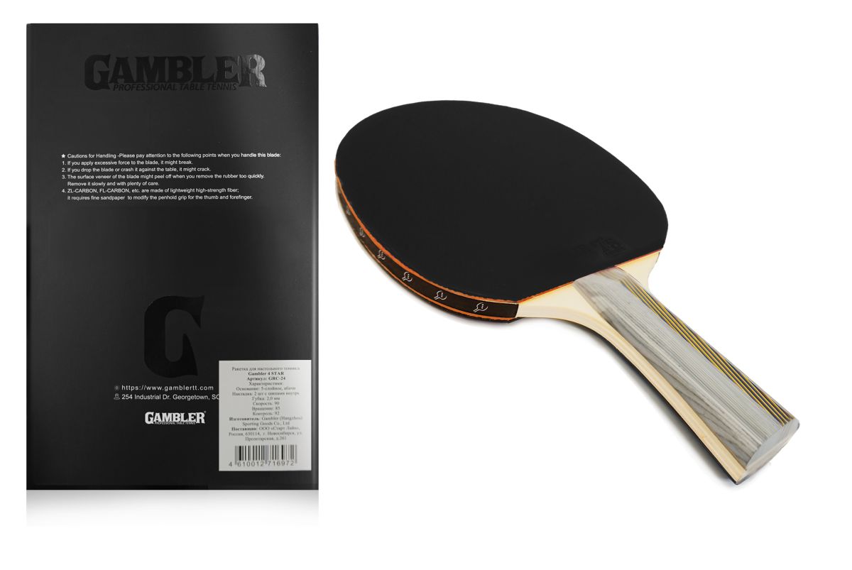 Ракетки Gambler – это уникальный вариант для любителей и профессионалов настольного тенниса. Ракетки Gambler от Start Line собраны из отдельных комплектующих, которые отличаются достойным качеством и прочностью. Ракетка Gambler 4 STAR с конической рукояткой имеет небольшой диаметр хвата и подойдет для игроков с узкой ладонью. Коническая рукоятка считается одной из самых удобных и популярных форм ручек.nbsp;nbsp; Основание ракетки Gambler 4 STAR выполнено из 5 слоев абачи — специально подобранная порода дерева. Такое количество слоев позволит играть с высокой скоростью мяча и сделать игру зрелищной. Ракетка оснащена спортивной твердой губкой толщиной 2,0 мм, c шипами внутрь, имеет сертификат ITTF . Показатель скорости 90 – ракетка подойдет для игры в нападении, вращение 85 – отлично подойдет для игры с подкрутками и подрезками, контроль 92 – позволит всем игрокам насладиться удобной игрой. Ракетки Gambler имеют хороший показатель контроля, улучшенные скорость и кручение. Нет ограничений по возрасту, ракетки могут быть использованы и детьми, и взрослыми.
