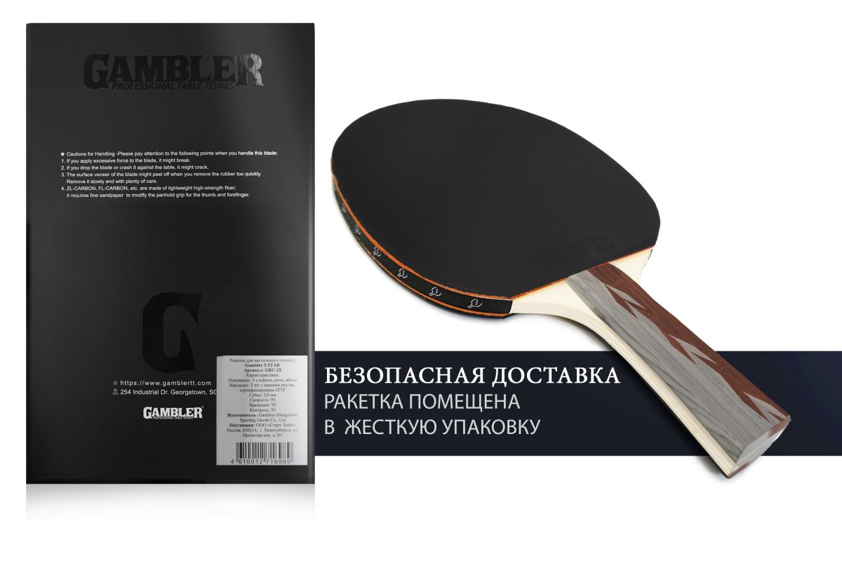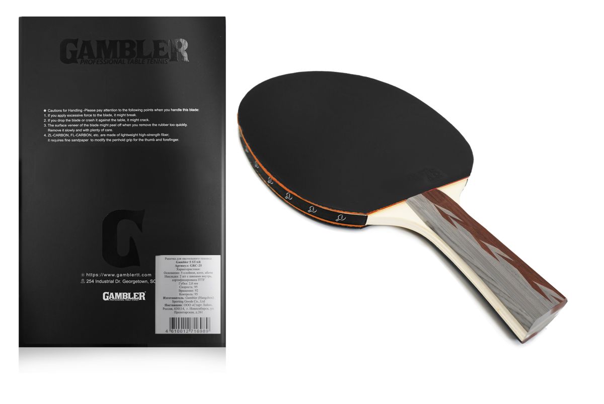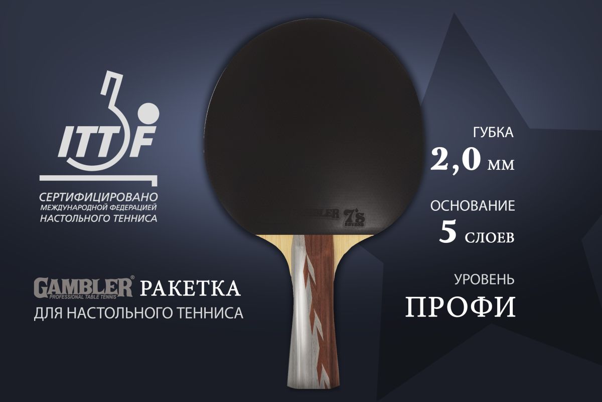 Ракетки Gambler – это уникальный вариант для любителей и профессионалов настольного тенниса. Ракетки Gambler от Start Line собраны из отдельных комплектующих, которые отличаются достойным качеством и прочностью. Ракетка Gambler 5 STAR имеет сертификат ITTF – это сертификат качества Международной федерации настольного тенниса. Ракетка полностью соответствует международным стандартам и подходят для игры на официальных соревнованиях и чепмпионатах. Ракетка с конической рукояткой имеет небольшой диаметр хвата и подойдет для игроков с узкой ладонью. Коническая рукоятка считается одной из самых удобных и популярных форм ручек. Основание ракетки Gambler 5 STAR выполнено из 5 слоев кото и абачи — специально подобранные породы дерева. Такое количество слоев позволит играть с высокой скоростью мяча и сделать игру зрелищной. Ракетка оснащена спортивной твердой губкой толщиной 2,0 мм, c шипами внутрь. Показатель скорости 95 – ракетка подойдет для игры в нападении, вращение 92 – отлично подойдет для игры с подкрутками и подрезками, контроль 95 – позволит всем игрокам насладиться удобной игрой. Ракетки Gambler имеют хороший показатель контроля, улучшенные скорость и кручение. Нет ограничений по возрасту, ракетки могут быть использованы и детьми, и взрослыми.