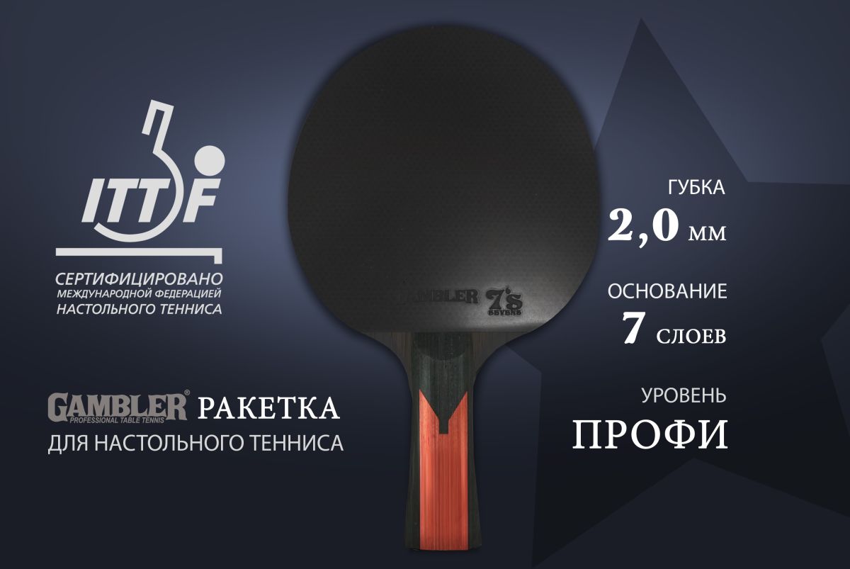Ракетки Gambler – это уникальный вариант для любителей и профессионалов настольного тенниса. Ракетки Gambler от Start Line собраны из отдельных комплектующих, которые отличаются достойным качеством и прочностью. Ракетка Gambler 7 STAR имеет сертификат ITTF – это сертификат качества Международной федерации настольного тенниса. Ракетка полностью соответствует международным стандартам и подходят для игры на официальных соревнованиях и чепмпионатах. Ракетка с конической рукояткой имеет небольшой диаметр хвата и подойдет для игроков с узкой ладонью. Коническая рукоятка считается одной из самых удобных и популярных форм ручек. Основание ракетки Gambler 7 STAR выполнено из 7 слоев абачи, карбона и свечного дерева — специально подобранные породы дерева. Чем больше слоёв, тем удобнее контролировать мяч, а скорость движения не будет слишком быстрой – это делает игру максимально комфортной. Ракетка оснащена спортивной твердой губкой толщиной 2,0 мм, c шипами внутрь. Показатель скорости 98 – ракетка подойдет для игры в нападении, вращение 98 – отлично подойдет для игры с подкрутками и подрезками, контроль 98 – позволит всем игрокам насладиться удобной игрой. Ракетки Gambler имеют хороший показатель контроля, улучшенные скорость и кручение. Нет ограничений по возрасту, ракетки могут быть использованы и детьми, и взрослыми.