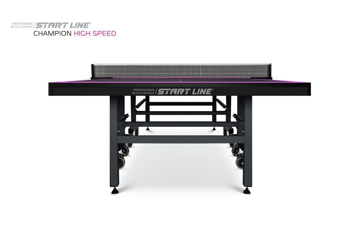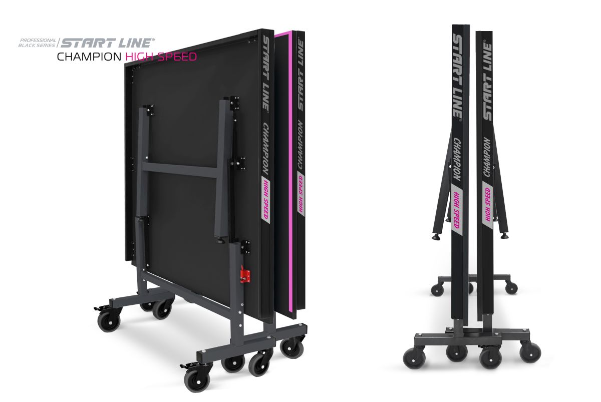 Теннисный стол Champion High Speed Black – это образец спортивного оборудования с высочайшими игровыми качествами и стильным дизайном.nbsp;nbsp; Столы серии Champion – это первые российские теннисные столы, которые лицензированы и одобрены Международной Федерацией настольного тенниса #40;ITTF#41; для проведения соревнований высокого уровня. Столы Champion отвечают всем современным требованиям настольного тенниса и успешно зарекомендовали себя на многочисленных турнирах. Размер стола в рабочем положении: 274 см в длину, 152,5 см в ширину и 76 см в высоту, что соответствует стандарту ITTF. Черное основание и столешница с фиолетовой разметкой придают столу элегантный и современный вид, делая его идеальным выбором для оснащения спортивных клубов и собственного тренировочного пространства. Champion High Speed Black выпускаются с обновленным игровым полем. Новая технология обработки поверхности игрового поля является собственной разработкой Start Line. Многослойная покраска обеспечивает высокую скорость игры и антибликовое покрытие, что позволяет улучшить видимость мяча во время игры. Стол укомплектован столешницей из прочного материала ЛДСП толщиной 25 мм, что обеспечивает высокий контроль над ударами и предсказуемый отскок мяча. Меламиновое покрытиеnbsp;nbsp;надежно защищает столешницу от появления трещин и сколов, а металлический кант 50x25 мм с полимерным покрытием и кромка из ПВХ 0,45 мм обеспечивают устойчивость и долговечность стола даже в условиях интенсивной эксплуатации. Обрезиненные колеса диаметром 125 мм на подшипниках гарантируют легкость перемещения. На каждой стороне стола установлено четыре колеса, два из которых оснащены тормозом, что гарантирует идеальную фиксацию и стабильность стола во время игры. Регулируемая высота боковых опор дает возможность адаптации стола к различным условиям, позволяя выставить идеальный уровень игрового поля даже на неровной поверхности. Механизм трансформации - собственная уникальная разработка Start Line.nbsp;nbsp;Сложить для хранения и разложить стол для игры без труда сможет один человек. Специальные фиксаторы позволяют надежно закрепить положение стола. Конструкцией предусмотрен режим одиночной игры PLAYBACK, который позволит тренироваться самостоятельно, отрабатывая навыки и точность ударов. Теннисный стол Champion High Speed Black – это идеальный выбор для профессиональных спортсменов,, стремящихся к высочайшим результатам и качеству.