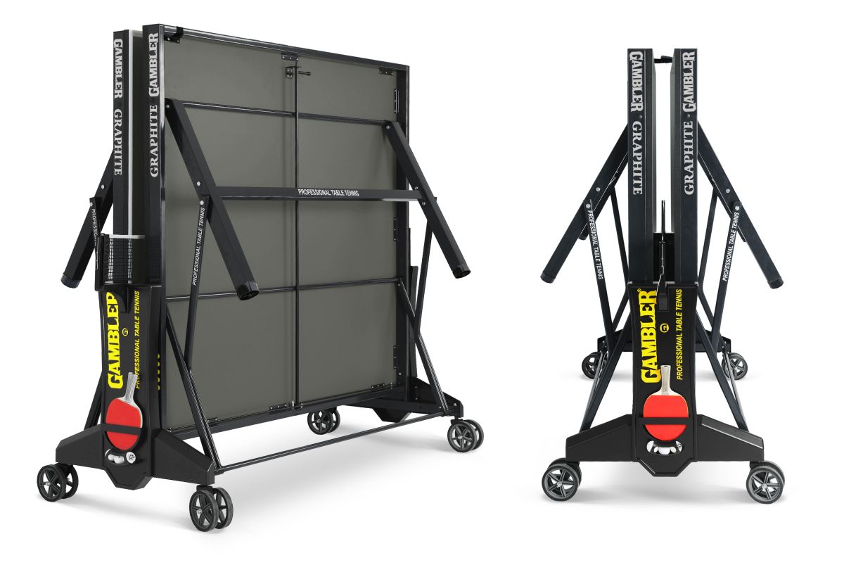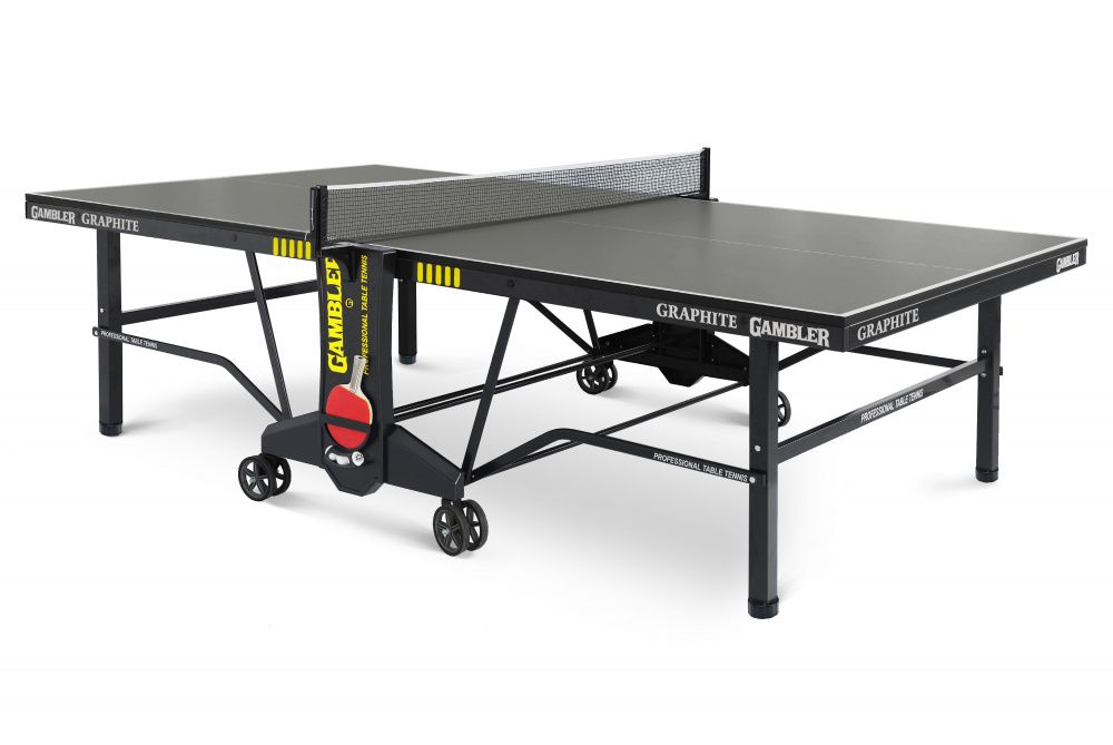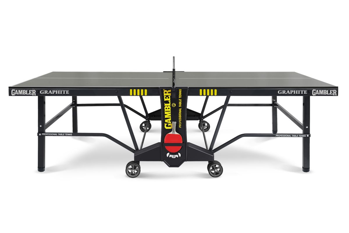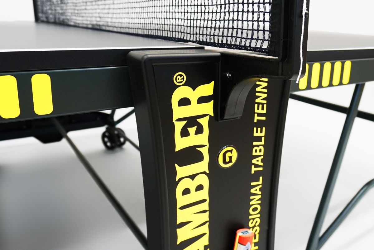 Теннисный стол для игры в помещении. Рекомендован к установке в теннисных клубах, для проведения соревнований, организации досуга. Конструкция оснащается уникальной системой складывания, которая фиксирует теннисный стол в сложенном и разложенном виде. Высота боковых опор регулируется по высоте и позволяет установить стол на неровной поверхности. Четыре пары прорезиненных колес гарантируют легкое и бережное перемещение стола. Комплектация стола включает встроенную сетку с натяжным механизмом и боковые накладки, предназначенные для хранения ракеток и мячей. Толщина столешницы обеспечивает отличный отскок мяча, что по достоинству оценят профессиональные игроки.