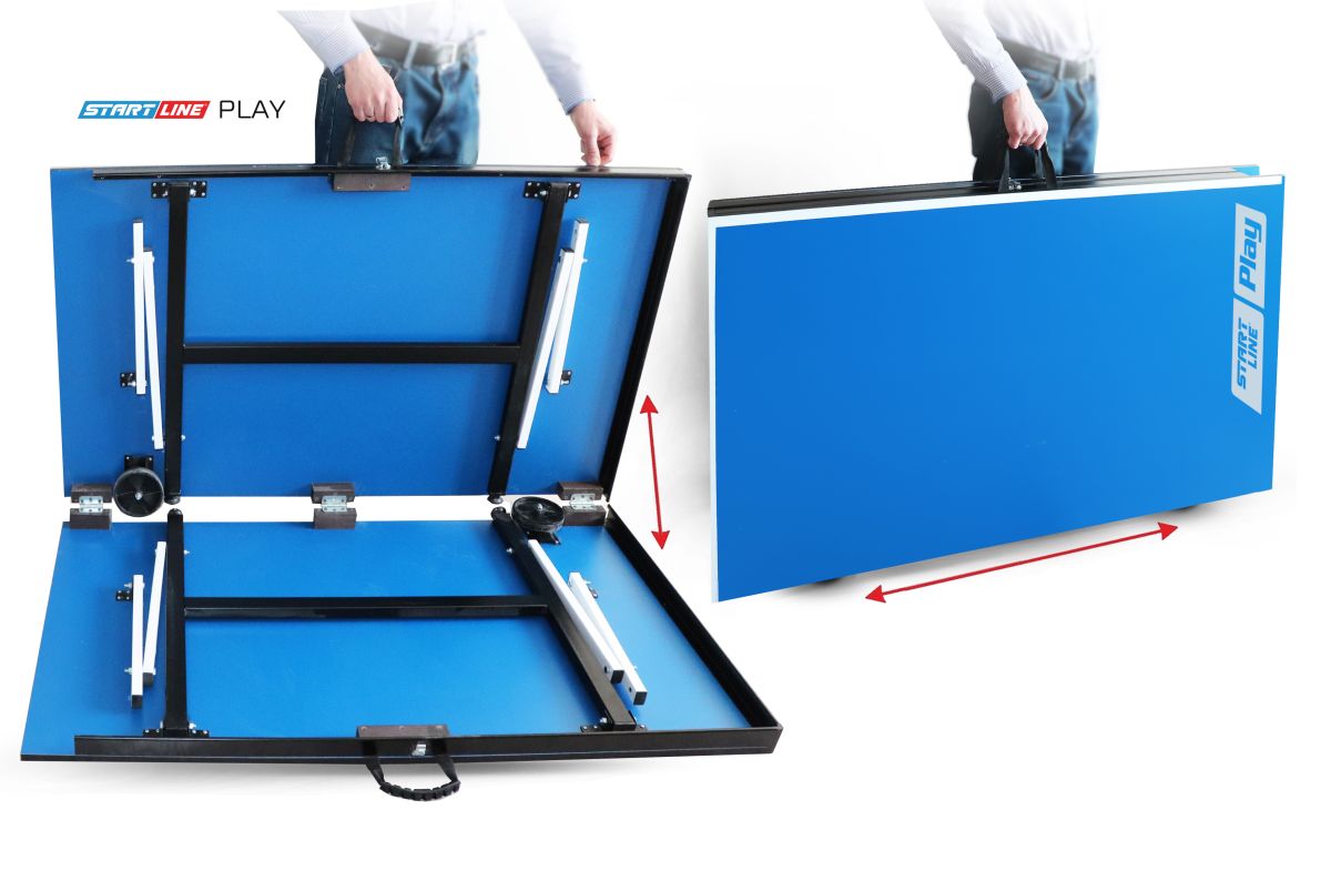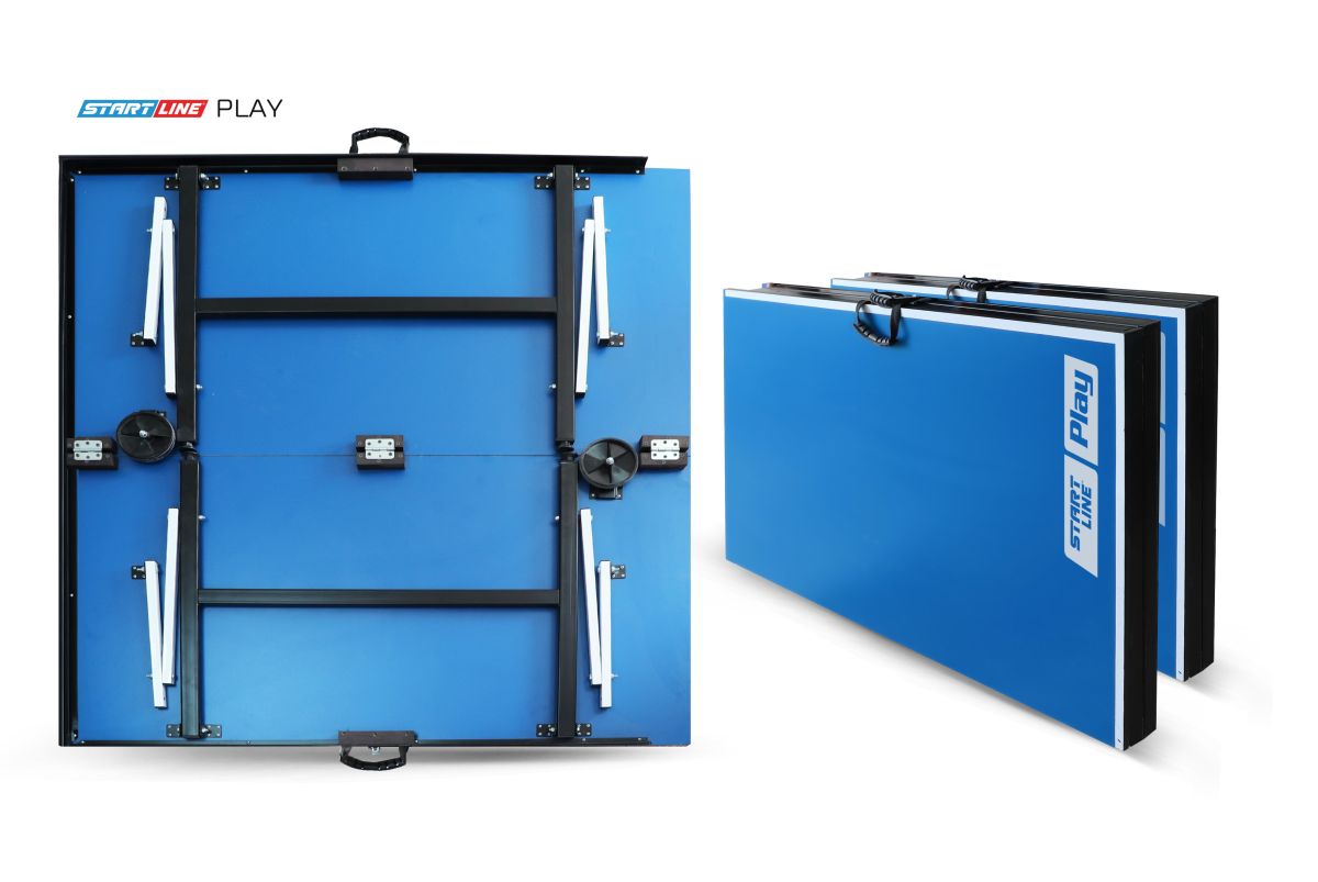 Новая разработка конструкторов Start Line представлена компактным столом для игры в помещении. Теннисный стол легко складывается до минимальных размеров. В сложенном виде помещается внутри багажника большинства автомобилей и занимает при хранении на 85#37; меньше места, чем стандартные столы. Размер теннисного стола в разложенном виде соответствует международному стандарту. Регулируемая высота боковых опор дает возможность выставить уровень игрового поля даже на неровной поверхности. Специальные надежные фиксаторы закрепляют положение как в разложенном, так и в сложенном виде. Наличие маневровых колес облегчает перемещение стола в нужную зону с помощью переносных ручек.