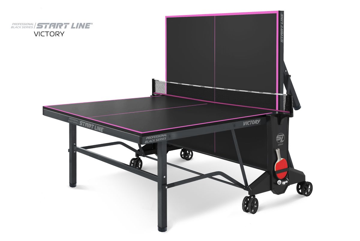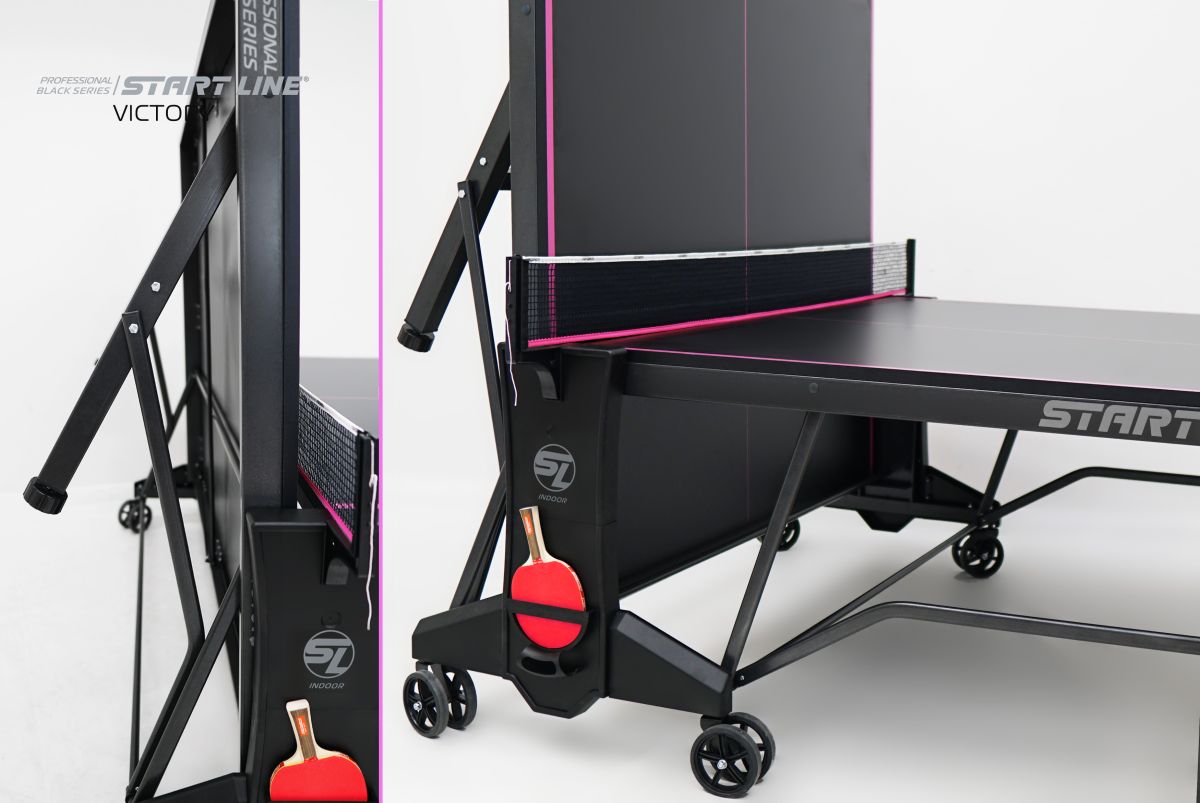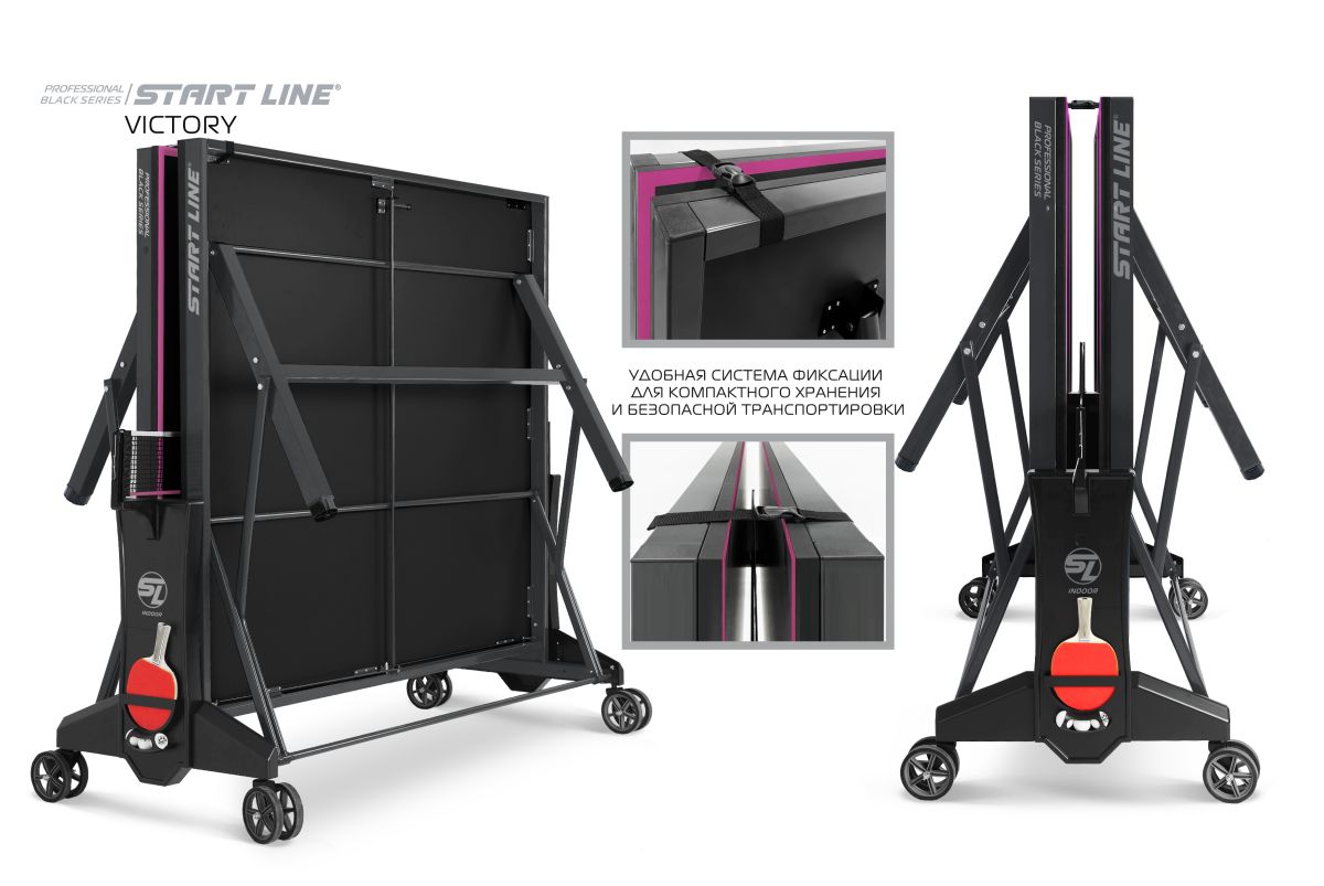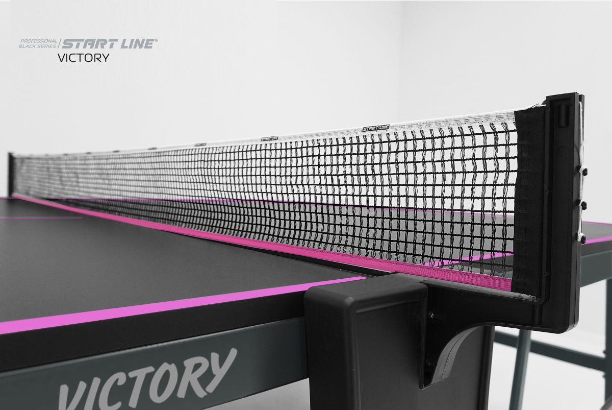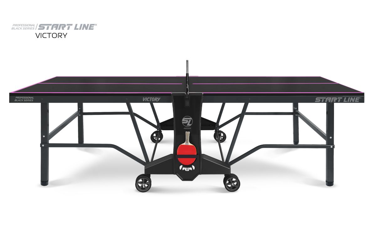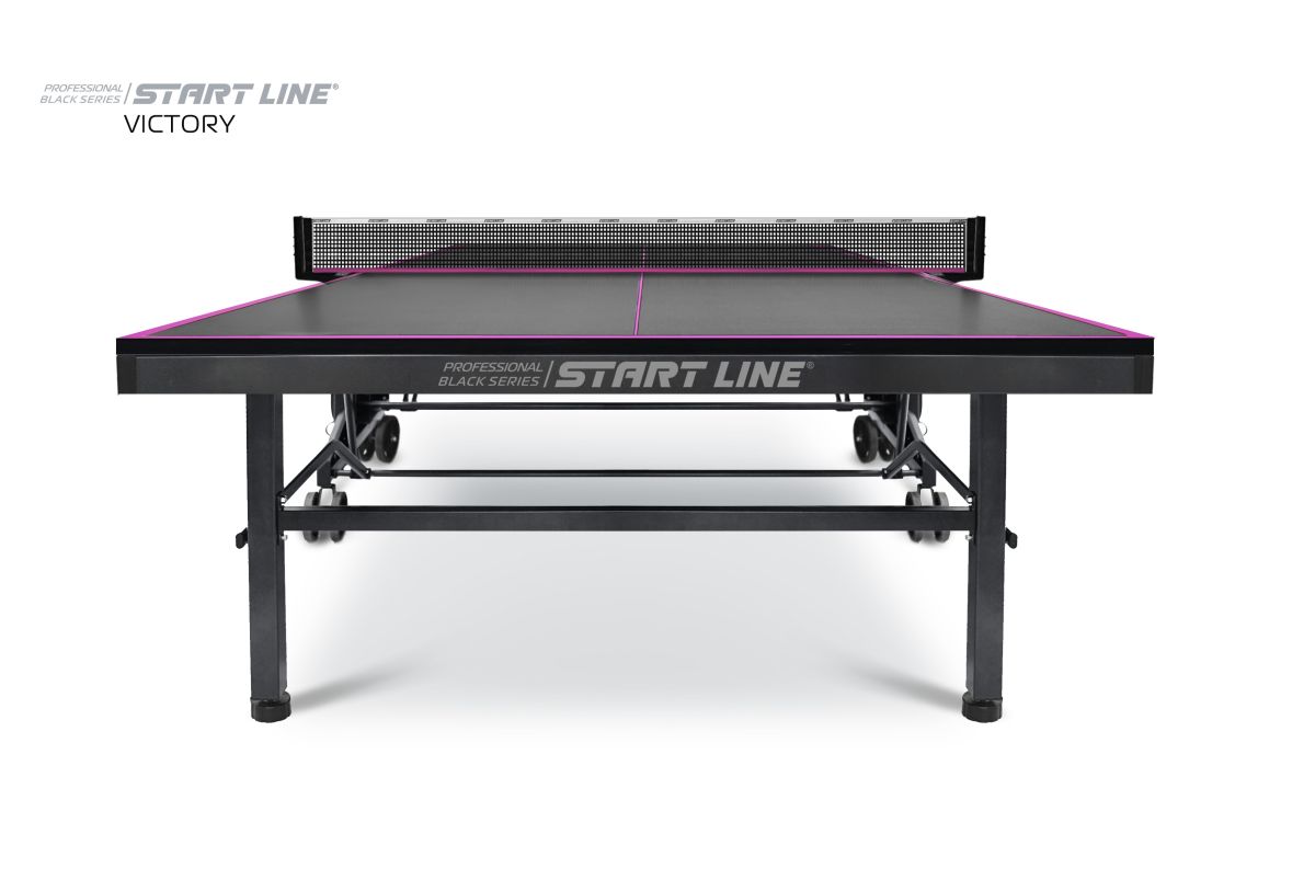 Victory Black – теннисный стол премиум сегмента для профессиональной игры в помещении.nbsp;nbsp;Высший уровень стиля и качества в мировой индустрии настольного тенниса от российского производителя! Стол Victory Blacknbsp;nbsp;имеет непревзойденное качество, а эффектный дизайн, который однозначно выделяет модель из общей линейки теннисного оборудования.nbsp;nbsp;Столешница и основание стола выполнены в глубоком черном цвете, что в сочетании с фиолетовой разметкой создает стильный и неповторимый образ теннисного стола. Victory Black разработан на базе последних тенденций при использовании современных методов построения теннисного стола. Наш опыт, наработанный годами, позволил вывести дизайн и качество продукта на высший уровень! Размер стола в рабочем положении: 274 см в длину, 152,5 см в ширину и 76 см в высоту, что соответствует стандарту ITTF. Толщина столешницы из высокопрочного ЛДСП 22 мм обеспечивает равномерный и предсказуемый отскок мяча по всей поверхности. Меламиновое покрытие надежно защищает столешницу от появления трещин и сколов, а кант 50x25 мм и кромка из ПВХ 0,45 мм обеспечивают устойчивость и долговечность стола даже в условиях интенсивной эксплуатации. Монеренные обрезиненные колеса диаметром 125 мм гарантируют легкое и бережное перемещение. Комфортная система складывания стола является собственной авторской разработкой Start Line. Она предусматривает усовершенствованный механизм, позволяющий быстро и надежно закрепить положение стола как в разложенном, так и в сложенном виде. Все манипуляции производятся с рабочего места игрока для каждой из столешниц. С такой системой складывания легко справляется один человек, а стол при хранении занимает минимум пространства. Дополнительная фиксация стола в сложенном виде позволяет просто и безопасно транспортировать стол. Конструкцией предусмотрен режим одиночной игры PLAYBACK для самостоятельной проработки точности ударов. Модель Victory Black укомплектована удобным держателем для ракеток и мячей с покрытием Soft-touchnbsp;nbsp;и встроенной сеткой с натяжным механизмом, не требующей демонтажа при складывании. Начать игру можно в любое время, ведь все необходимое оборудование всегда под рукой. Victory Black – профессиональный стол впечатляющего дизайна и совершенных игровых и конструкционных характеристик!