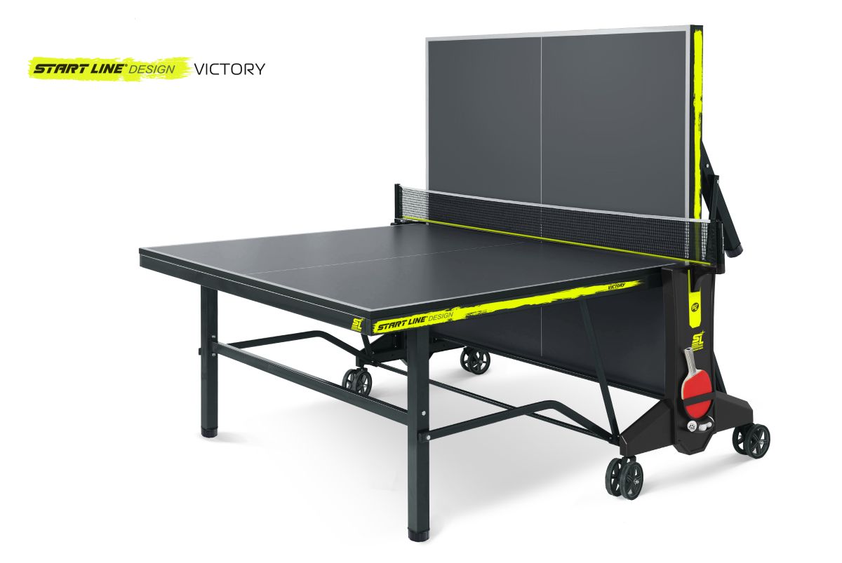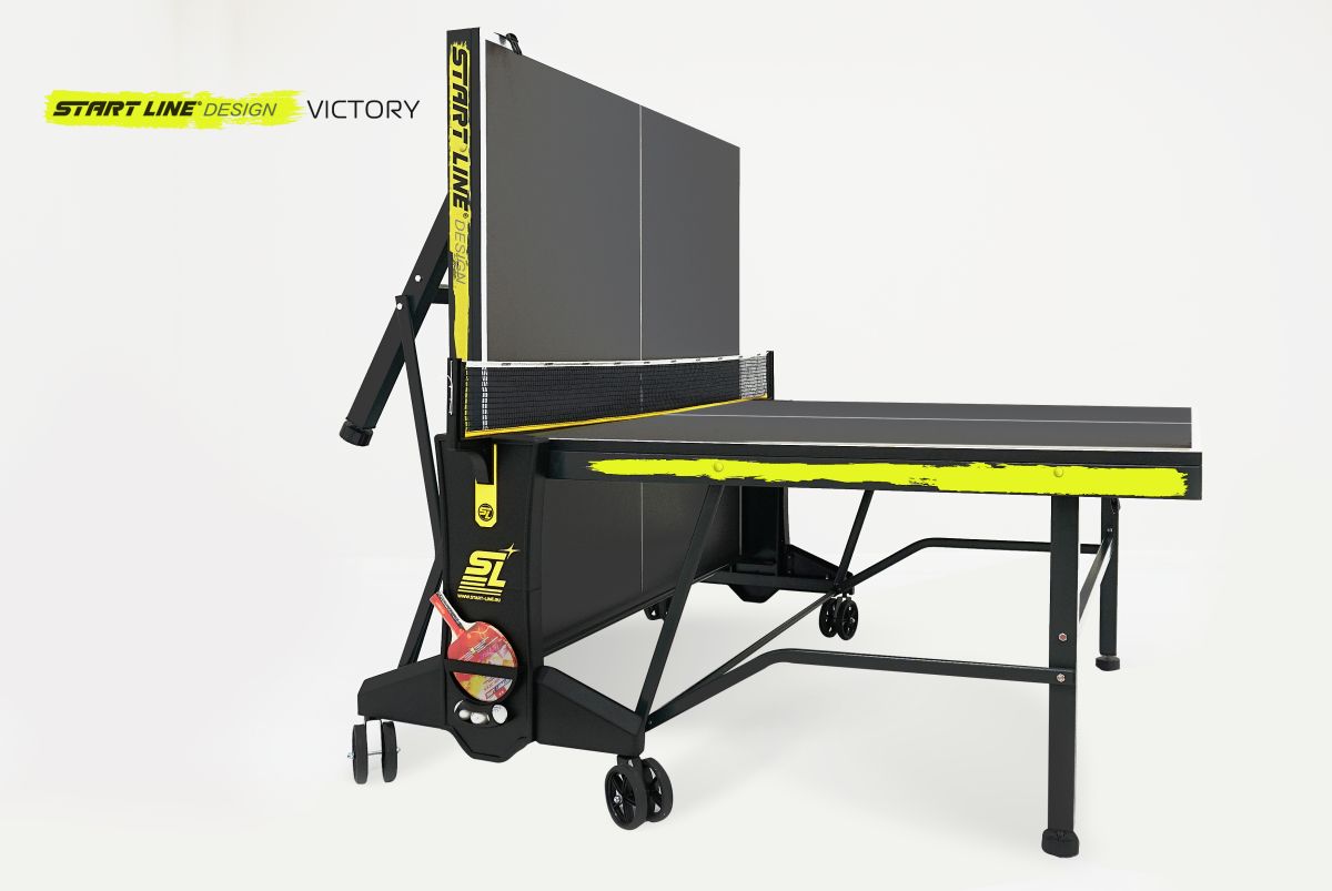 Start Line расширяет линейку своих теннисных столов модельюnbsp;nbsp;VICTORY DESIGN. Высший уровень стиля и качества в мировой индустрии настольного тенниса от российского производителя! Стол дизайнерской линии VICTORY DESIGN имеет непревзойденное качество, а эффектный дизайн однозначно выделяют эту модель из общей линейки нашего теннисного оборудования. Новая разработка выполнена на базе последних тенденций. При создании модели использовались только современные методы построения теннисного стола. Наш опыт, наработанный годами, позволил вывести дизайн и качество продукта на высший уровень. VICTORY DESIGN предназначен для игры в помещении. Его размер соответствует международным стандартам ITTF. Игровое поле выполнено в элегантном цвете графит. Толщина столешницы из высокопрочного лдсп 22 мм обеспечивает равномерный отскок мяча по всей поверхности. Комфортная система складывания стола является собственной авторской разработкой Start Line. Она предусматривает усовершенствованный механизм, позволяющий быстро и надежно закрепить положение стола как в разложенном, так и в сложенном виде. В сложенном виде одной половины столешницы предусмотрен вариант для одиночной игры. Все манипуляции производятся с рабочего места игрока для каждой из столешниц. С такой системой складывания легко справляется один человек, а стол при хранении занимает минимум пространства. Конструкция также предусматривает дополнительную фиксацию в сложенном виде для компактного хранения и безопасной транспортировки стола. Регулируемая высота боковых опор дает возможность установить стол на неровной поверхности. Стол легко перемещать благодаря 4-м сдвоенным прорезиненным маневровым колесам. Каркас и металлические тяги, выкрашенные в эксклюзивный цвет графит, позволяют надежно зафиксировать стол в рабочем положении на любой поверхности, сохраняя столешницу строго в горизонтальной плоскости. Конструкция предусматривает в боковых накладках наличие пенала для хранения мячей и ракеток. VICTORY DESIGN – стол впечатляющего дизайна, эксклюзивной системы трансформации, совершенных игровых и конструкционных характеристик!