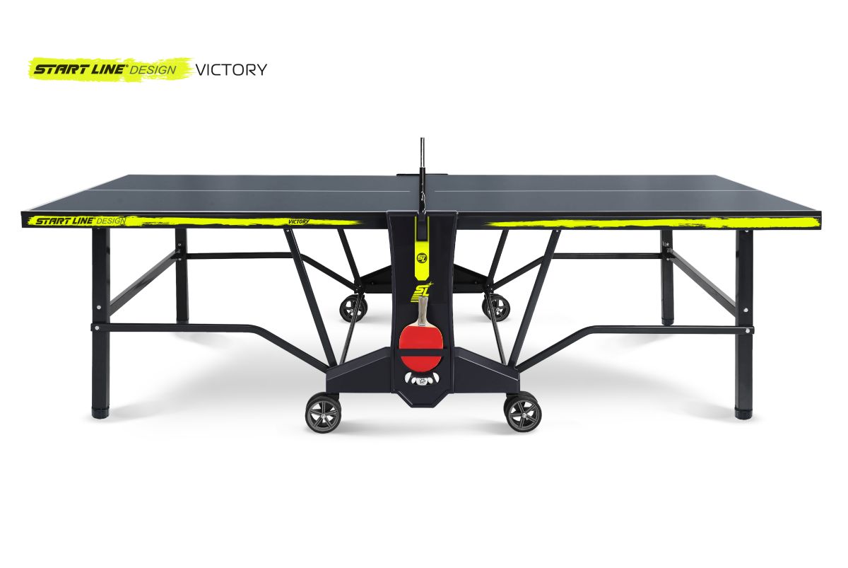 Start Line расширяет линейку своих теннисных столов модельюnbsp;nbsp;VICTORY DESIGN. Высший уровень стиля и качества в мировой индустрии настольного тенниса от российского производителя! Стол дизайнерской линии VICTORY DESIGN имеет непревзойденное качество, а эффектный дизайн однозначно выделяют эту модель из общей линейки нашего теннисного оборудования. Новая разработка выполнена на базе последних тенденций. При создании модели использовались только современные методы построения теннисного стола. Наш опыт, наработанный годами, позволил вывести дизайн и качество продукта на высший уровень. VICTORY DESIGN предназначен для игры в помещении. Его размер соответствует международным стандартам ITTF. Игровое поле выполнено в элегантном цвете графит. Толщина столешницы из высокопрочного лдсп 22 мм обеспечивает равномерный отскок мяча по всей поверхности. Комфортная система складывания стола является собственной авторской разработкой Start Line. Она предусматривает усовершенствованный механизм, позволяющий быстро и надежно закрепить положение стола как в разложенном, так и в сложенном виде. В сложенном виде одной половины столешницы предусмотрен вариант для одиночной игры. Все манипуляции производятся с рабочего места игрока для каждой из столешниц. С такой системой складывания легко справляется один человек, а стол при хранении занимает минимум пространства. Конструкция также предусматривает дополнительную фиксацию в сложенном виде для компактного хранения и безопасной транспортировки стола. Регулируемая высота боковых опор дает возможность установить стол на неровной поверхности. Стол легко перемещать благодаря 4-м сдвоенным прорезиненным маневровым колесам. Каркас и металлические тяги, выкрашенные в эксклюзивный цвет графит, позволяют надежно зафиксировать стол в рабочем положении на любой поверхности, сохраняя столешницу строго в горизонтальной плоскости. Конструкция предусматривает в боковых накладках наличие пенала для хранения мячей и ракеток. VICTORY DESIGN – стол впечатляющего дизайна, эксклюзивной системы трансформации, совершенных игровых и конструкционных характеристик!