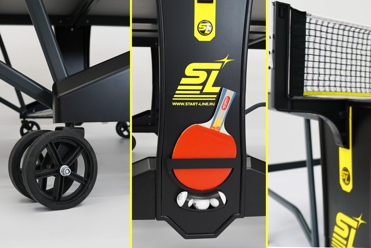 Start Line представляет новую модель всепогодного теннисного стола в эксклюзивном дизайне для игры на улице - VICTORY DESIGN Outdoor! VICTORY DESIGN Outdoor - новейшие технологии, уникальная конструкция и стильный дизайн от российского производителя для истинных ценителей качественного теннисного оборудования! Высочайшие игровые характеристики, современный стиль и передовые конструкторские технологии выделяют модель VICTORY DESIGN Outdoor среди аналогов теннисного оборудования для игры на улице. Наш опыт, наработанный годами, позволил вывести дизайн и качество новой модели на высший уровень. Размерные характеристики стола VICTORY DESIGN Outdoor соответствует международным стандартам. Столешница всепогодной модели изготовлена из высокопрочного и долговечного материала АКП толщиной 6 мм, который надежно защищает стол от воздействия окружающей среды, а также дает равномерный отскок до 23,5 см. Поля столешницы обработаны фрезером по периметру, что предотвращает риск получения травм, гарантируя безопасность игроков. Алюминиевый слой столешницы из АКП 6 мм имеет толщину 0,3 мм. В отличие от конкурентов, у которых толщина алюминиевого слоя составляет всего 0,21 мм, Start Line гарантирует надежную защиту теннисных столов от коррозии и механических повреждений. Комфортная система складывания стола является собственной разработкой Start Line. Она предусматривает усовершенствованный механизм, позволяющий быстро и надежно закрепить положение стола как в разложенном, так и в сложенном виде. Все манипуляции производятся с рабочего места игрока для каждой из столешниц. С такой системой складывания легко справляется один человек, а стол при хранении занимает минимум пространства. Конструкция предусматривает дополнительную фиксацию в сложенном виде безопасной транспортировки стола, а также возможность одиночной игры. Наличие четырех пар прорезиненных колес обеспечивает плавную маневренность и упрощает транспортировку стола. Каркас и металлические тяги, выкрашенные в эксклюзивный цвет графит, позволяют разместить стол строго горизонтально на любой поверхности вне зависимости от рельефа. Модель оснащена боковыми пеналами для хранения спортивного инвентаря, а также встроенной сеткой с натяжным механизмом. Профессиональный дизайнерский теннисный стол VICTORY DESIGN Outdoor в элегантном графитовом цвете станет стильным дополнением спортивной площадки, зоны отдыха на свежем воздухе или двора загородного дома.