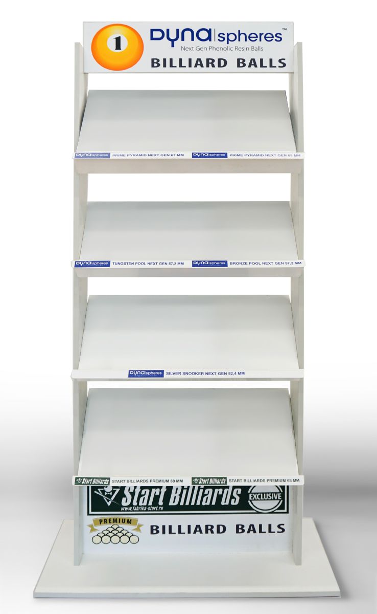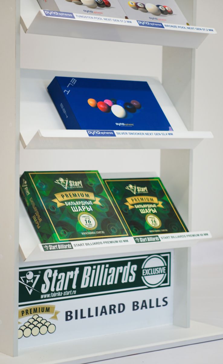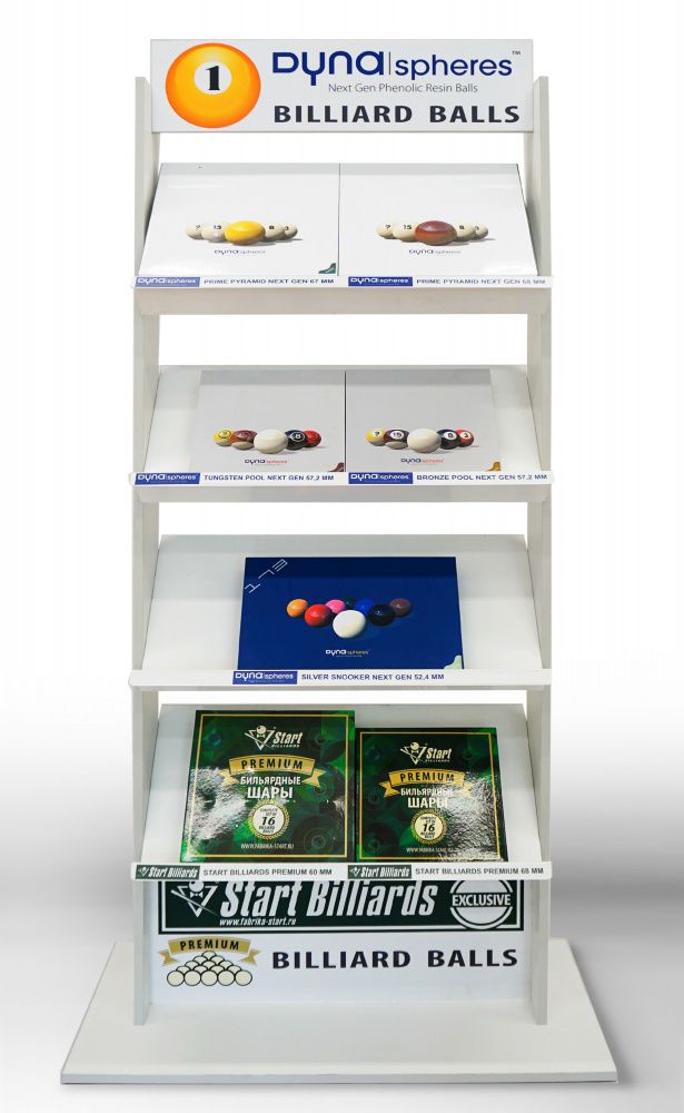 Стойка под бильярдные шары: Dynaspheres, Startbilliards. Изделие из ЛДСП и металла, фирменное брендирование. Размер в собранном виде: 890х410х1910 мм