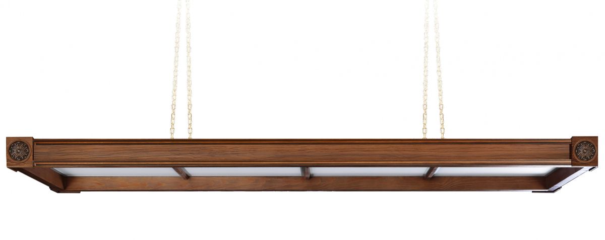 Светильник выполнен в соответствии с эксклюзивным дизайном бильярдной коллекции «Гроссмейстер». Модель состоит из четырех секций, дает равномерное освещение бильярдных столов 11 и 12 футов. Мягкий поток света обеспечивает равномерное и бестеневое освещение стола и максимально комфортные условия для игроков. Корпус светильника выполнен из массива сосны. Конструкция крепится к потолку с помощью подвесов, входящих в крепежный комплект.