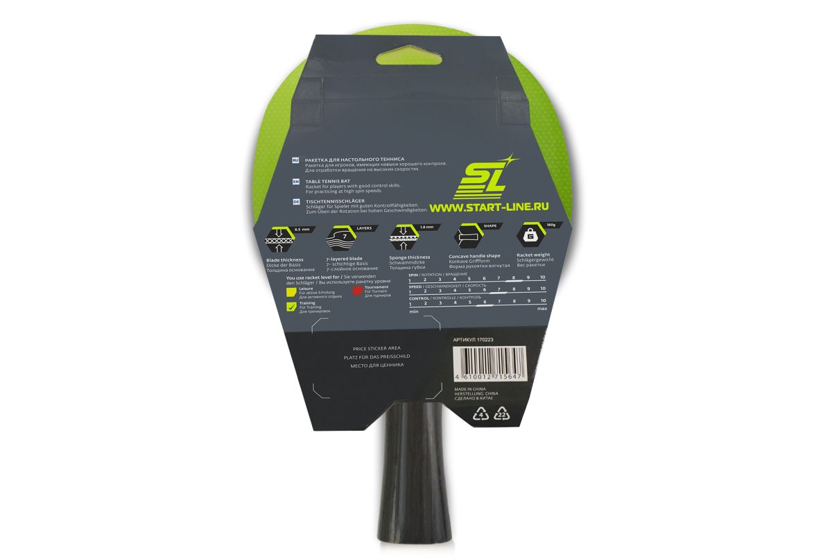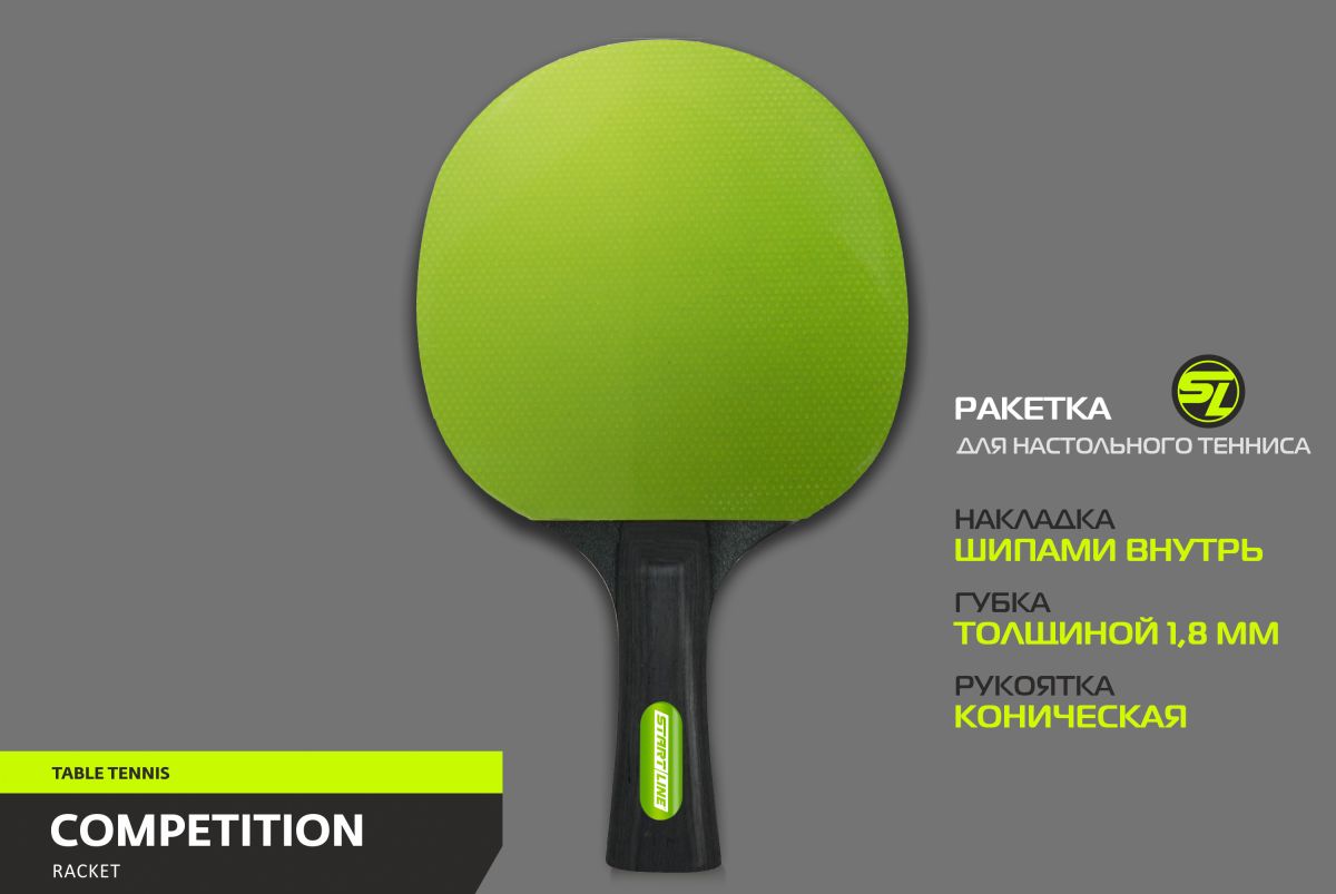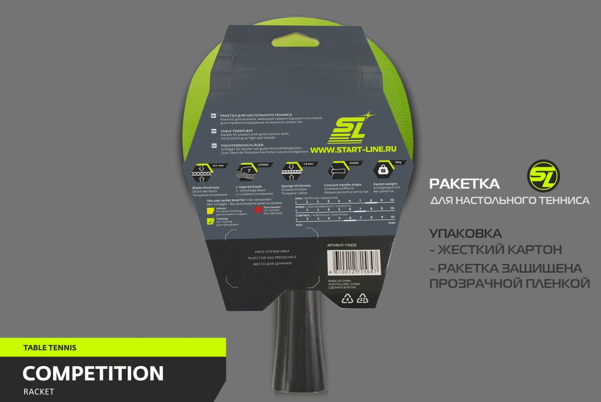 Основание 7 слоев черное дерево, тополь, толщина основание 6,5мм; Накладка с шипами внутрь, толщиной 1,8 мм Вращение 8, Скорость 7, Контроль 6 форма ручки коническая Теннисный инвентарь от ведущего Российского производителя Start Line отличают безупречное качество, надежность эксплуатации, а также высокие игровые характеристики. Продукция рассчитана для игроков с разным уровнем подготовки: от новичков до профессионалов, а также могут использоваться как дома, так и в спортивных школах, на соревнованиях. Ракетки Start Line – это уникальный вариант для любителей и профессионалов настольного тенниса. Ракетки от Start Line собраны из отдельных комплектующих, которые отличаются достойным качеством и прочностью. Ракетка SL COMPETITION с конической рукояткой имеет небольшой диаметр хвата и подойдет для игроков с узкой ладонью. Коническая рукоятка считается одной из самых удобных и популярных форм ручек. Основание ракетки SL COMPETITION выполнено из 7 слоев чёрного дерева и тополя — специально подобранные породы дерева. Чем больше слоёв, тем удобнее контролировать мяч, а скорость движения не будет слишком быстрой – это делает игру максимально комфортной. Ракетки SL COMPETITION имеют хороший показатель контроля, улучшенные скорость и кручение. Нет ограничений по возрасту, ракетки могут быть использованы и детьми, и взрослыми.
