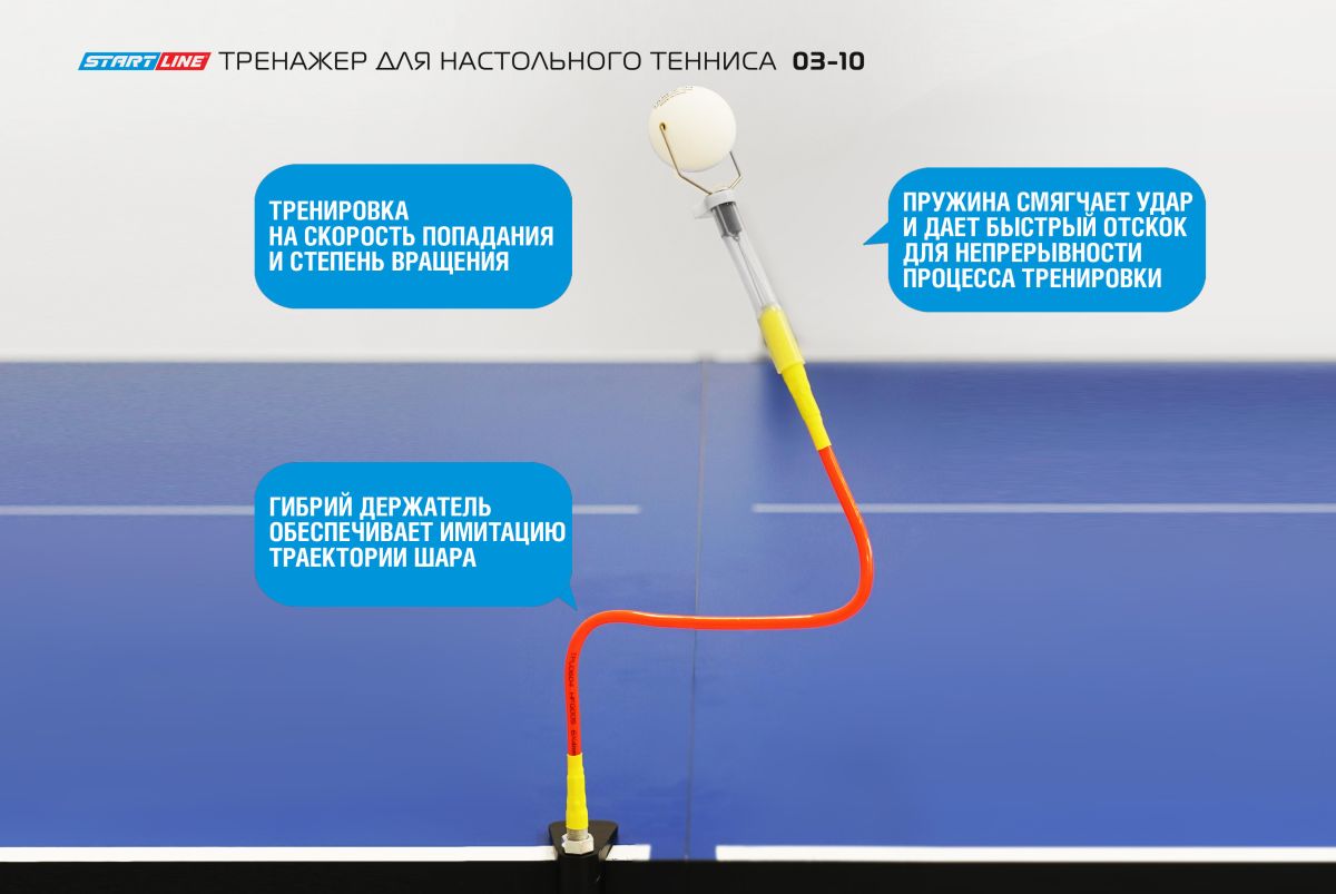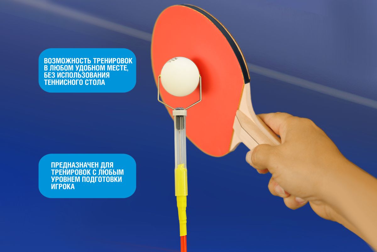 Тренажер для настольного тенниса 03-10 на гибком держателе предназначен для обучения новичков технике ударов по мячу слева и справа, технике подач, технике передвижения в разных направлениях, обучение и корректировка техники ударов по мячу или отдельных частей ударных движений. ПРЕИМУЩЕСТВА МОДЕЛИ - Способствует освоению техники передвижения и нанесения ударов с различных точек при установке нескольких тренажеров на столе одновременно. - Способствует изучению типов вращения и точности выполнения удара при отработке подач. - Способствует отработке тактических комбинаций розыгрыша очка. - Обучает поддержанию заданного темпа игры или, наоборот, умение его смены через необходимое число ударов. - Тренирует выносливость и гибкость мышц кисти, предплечья, плеча. - Способствует тренировке силовых и скоростных параметров выполнения ударов. - Тренирует синхронизацию действий ног и рук при выполнении разноплановых ударов. - Гибкий держатель адаптивен под рост пользователя.