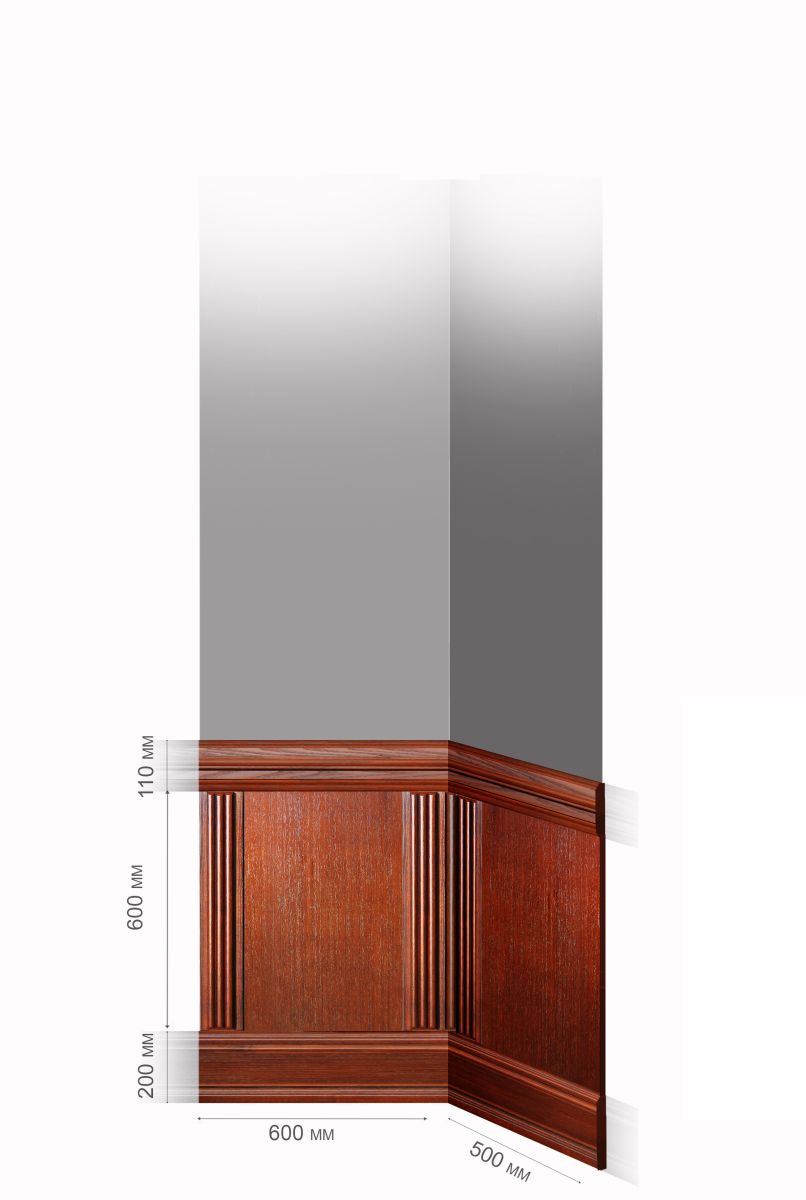 Угловой узел «Эконом» - используется для оформления углов стен в едином стиле с основными стенами и помогает выдерживать общую направленность в интерьере. В собранном виде интерьерные панели закрывают нижнюю часть стены. Узел угловой деревянных панелей «Эконом» включает в себя: горизонтальные направляющие; плинтус; вертикальные направляющие; доборные панели, которые монтируются на месте с учетом размера и рельефа прилегающей стены.