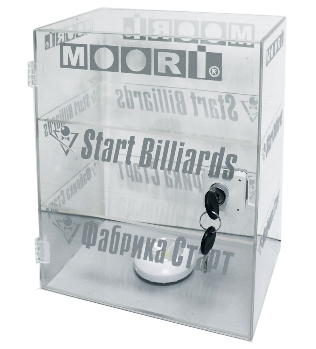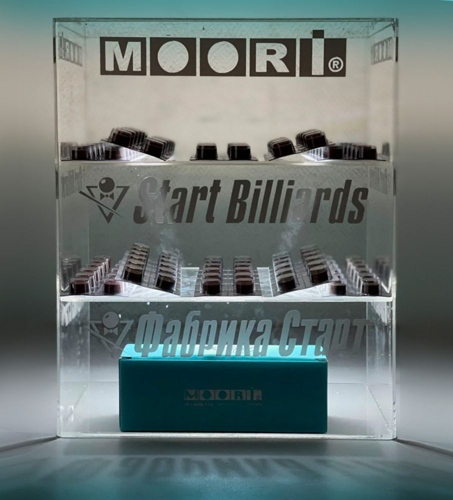 Витрина под наклейки для кия: Moori, Startbilliards. Изделие из оргстекла, дверца с замком, брендирование с 4-х сторон, подсветка.